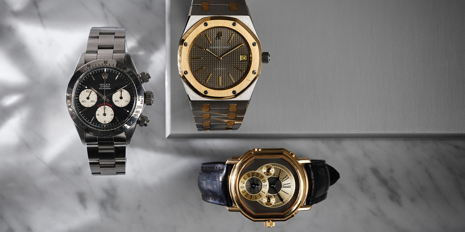 Bland auktionens höjdpunkter finns en eftertraktad Rolex Daytona "Big Red" referens 6265, en tidig Audemars Piguet Royal Oak referens 5402, samt flera exemplar av den ikoniska Patek Philippe Nautilus, däribland 5711 i stål. Även flera generationer av Patek Philippe Aquanaut, inklusive Travel Time.
