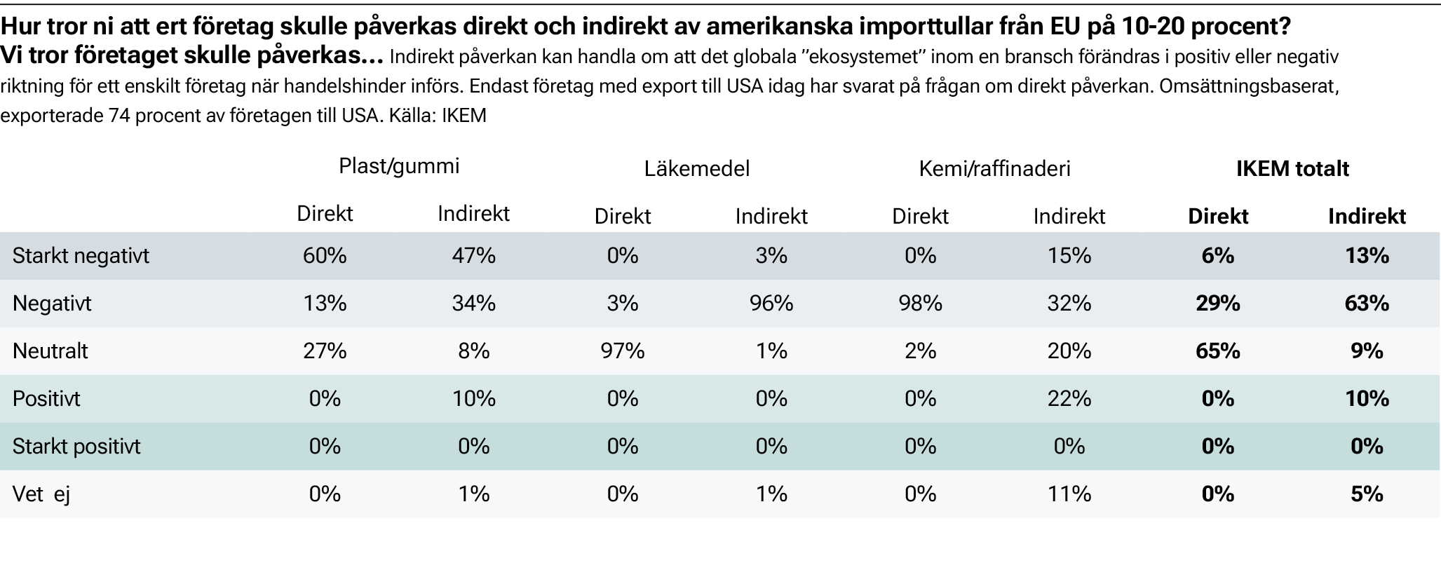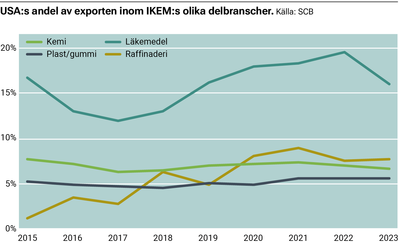 – Läkemedelsindustrin befarar framför allt indirekta negativa effekter av tullarna, medan kemi-, plast- och gummiindustrin och raffinaderierna riskerar drabbas såväl direkt som indirekt. Situationen är allvarlig för svensk och europeisk konkurrenskraft, säger Jonas Hagelqvist, vd, IKEM.