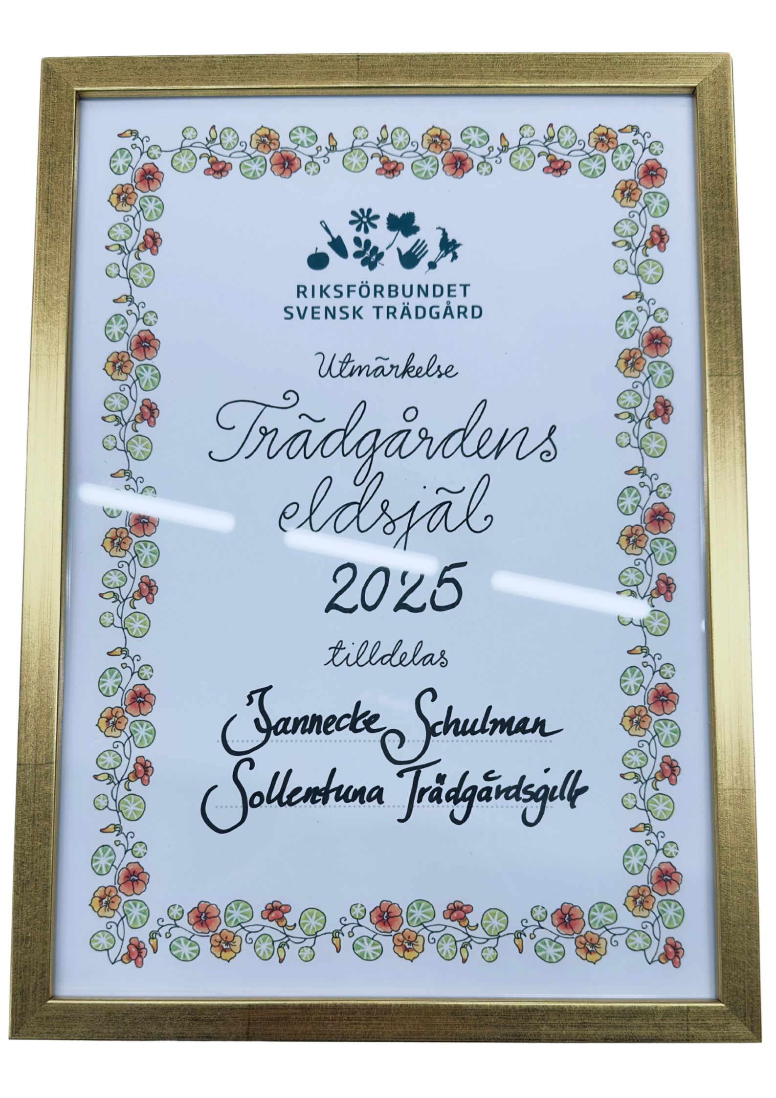 Jannecke Schulman i Sollentuna Trädgårdsgille prisas som Årets Trädgårdens Eldsjäl 2025. Utmärkelsen delades ut på mässan Nordiska Trädgårdar i Älvsjö den 27 mars, till en trädgårdsentusiast som genom passion och engagemang har gjort en stor insats för sin trädgårdsförening och för trädgårdskulturen på sin ort.