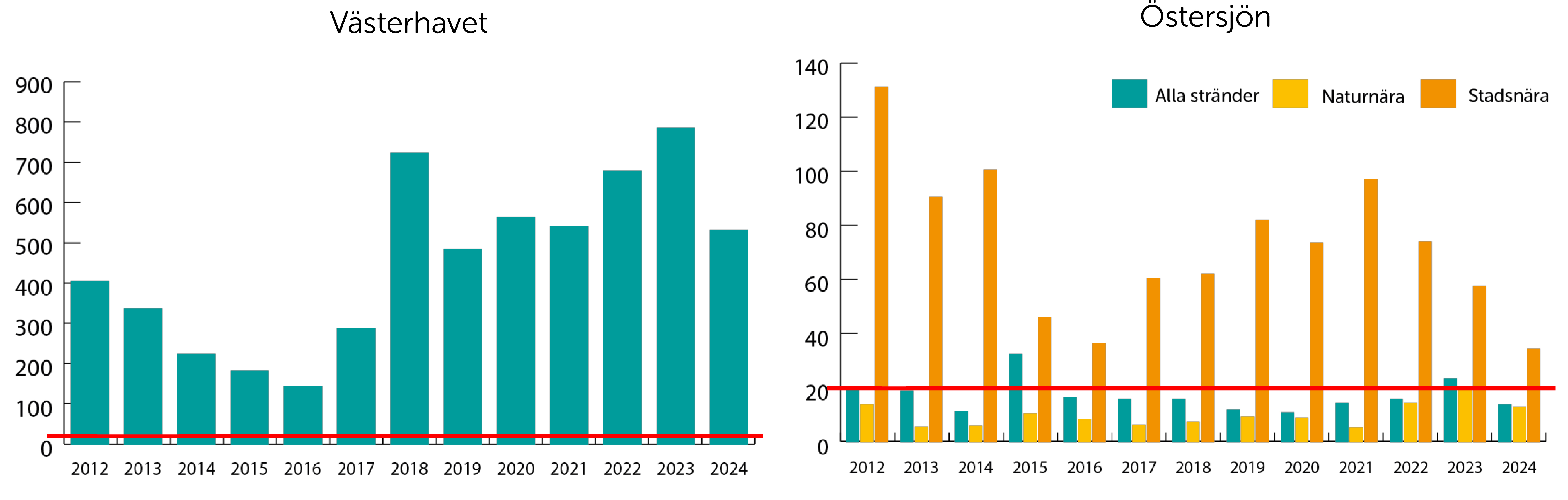 I genomsnitt (median) hittades 532 skräp per 100 meter strand längs Västerhavet, vilket är 27 gånger mer än EU:s gränsvärde för vad som anses vara en god miljöstatus. Plast utgör hela 99 % av det totala skräpet på stränder längs Västerhavet. Plastkorkar och ballonger är två skräp som ökar på stränder längs Västerhavet. Under 2024 hittades i genomsnitt 144 plastkorkar och 16 ballonger per 100 meter strand, en ökning som bryter den tidigare nedåtgående trenden.