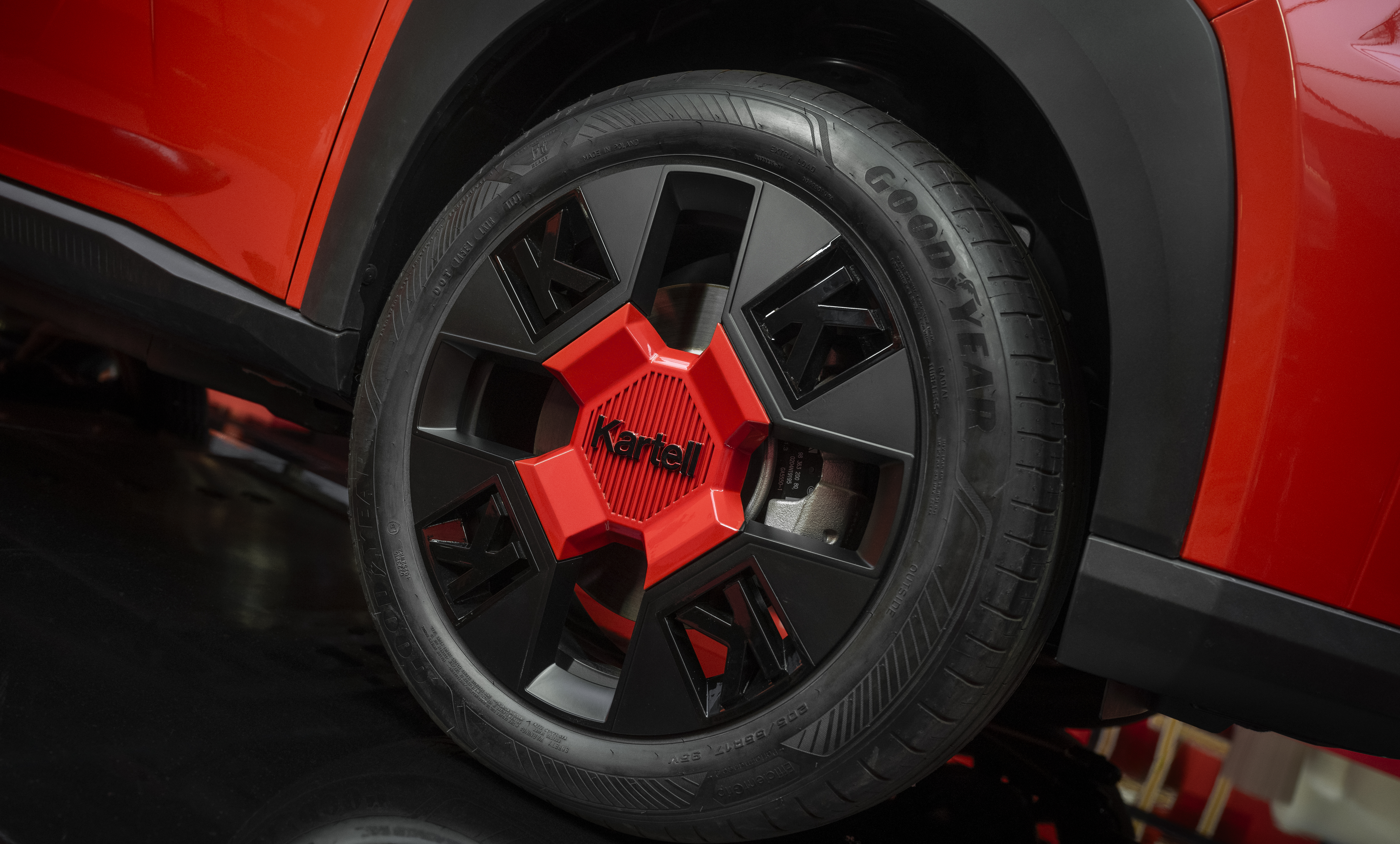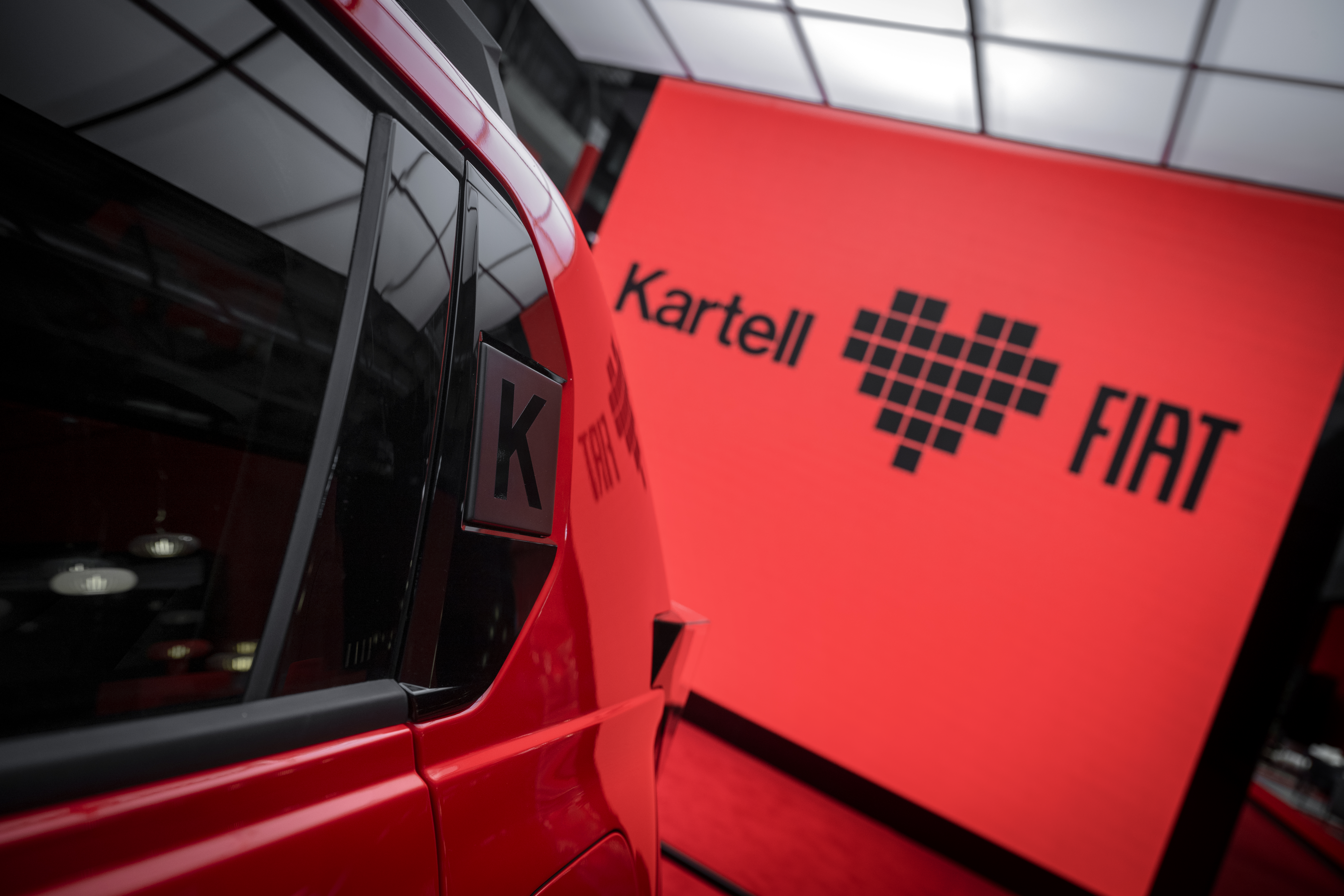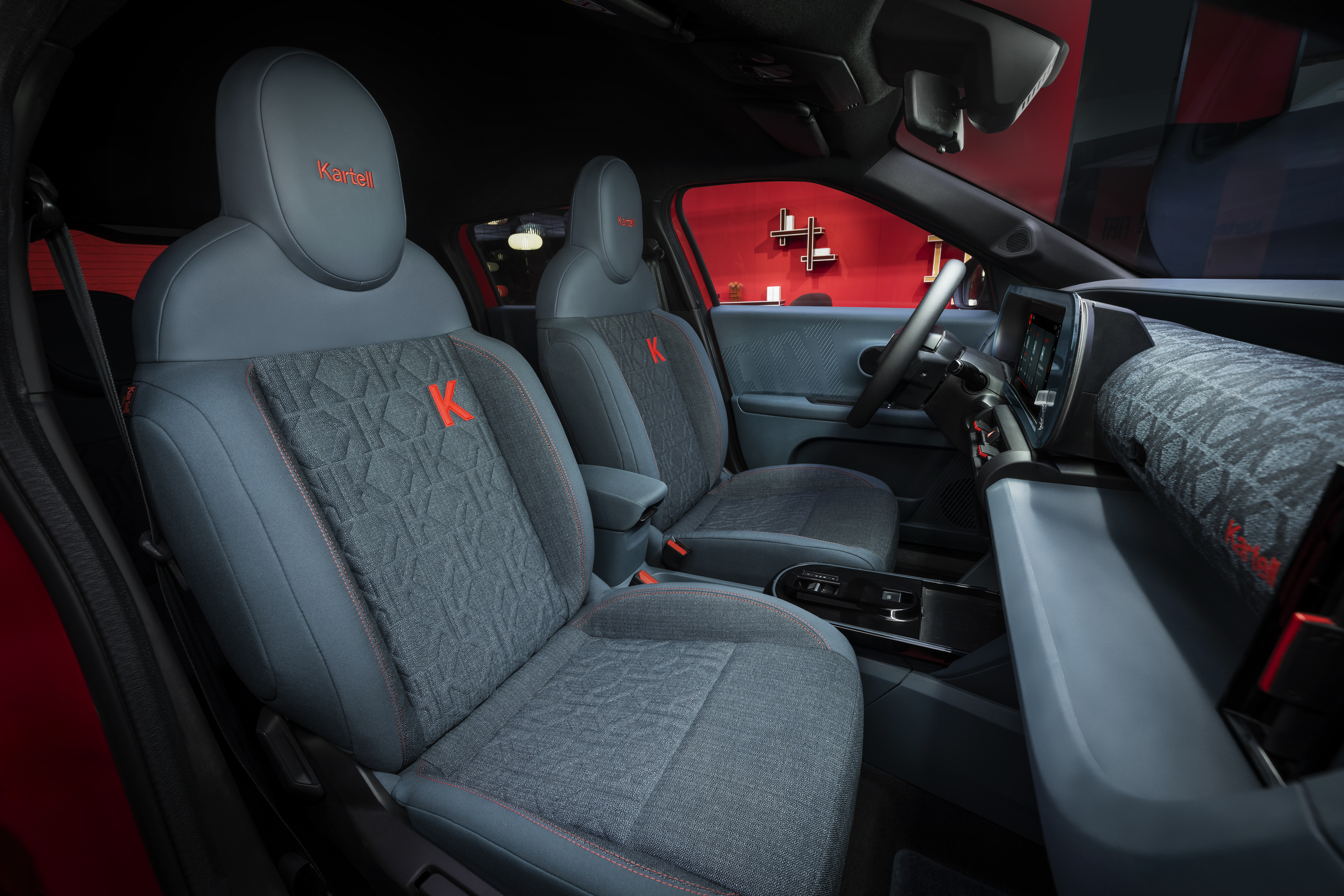 Kartells logotyp, som symboliserar Love-varumärket, är ett centralt dekorativt inslag och finns på flera strategiska ställen – som hjulen, bakpartiet och den C-stolpen. Inuti bilen pryds passagerarutrymmet av en lekfull användning av varumärket: den termopräglade ”kk”-monogrammet ger en tredimensionell känsla och återfinns på alla klädslar. Dessa är tillverkade av toppmoderna tyger, som Pop-melange canvas, vilket tillför både modernitet och stil, samtidigt som interiören behåller en varm och inbjudande känsla.