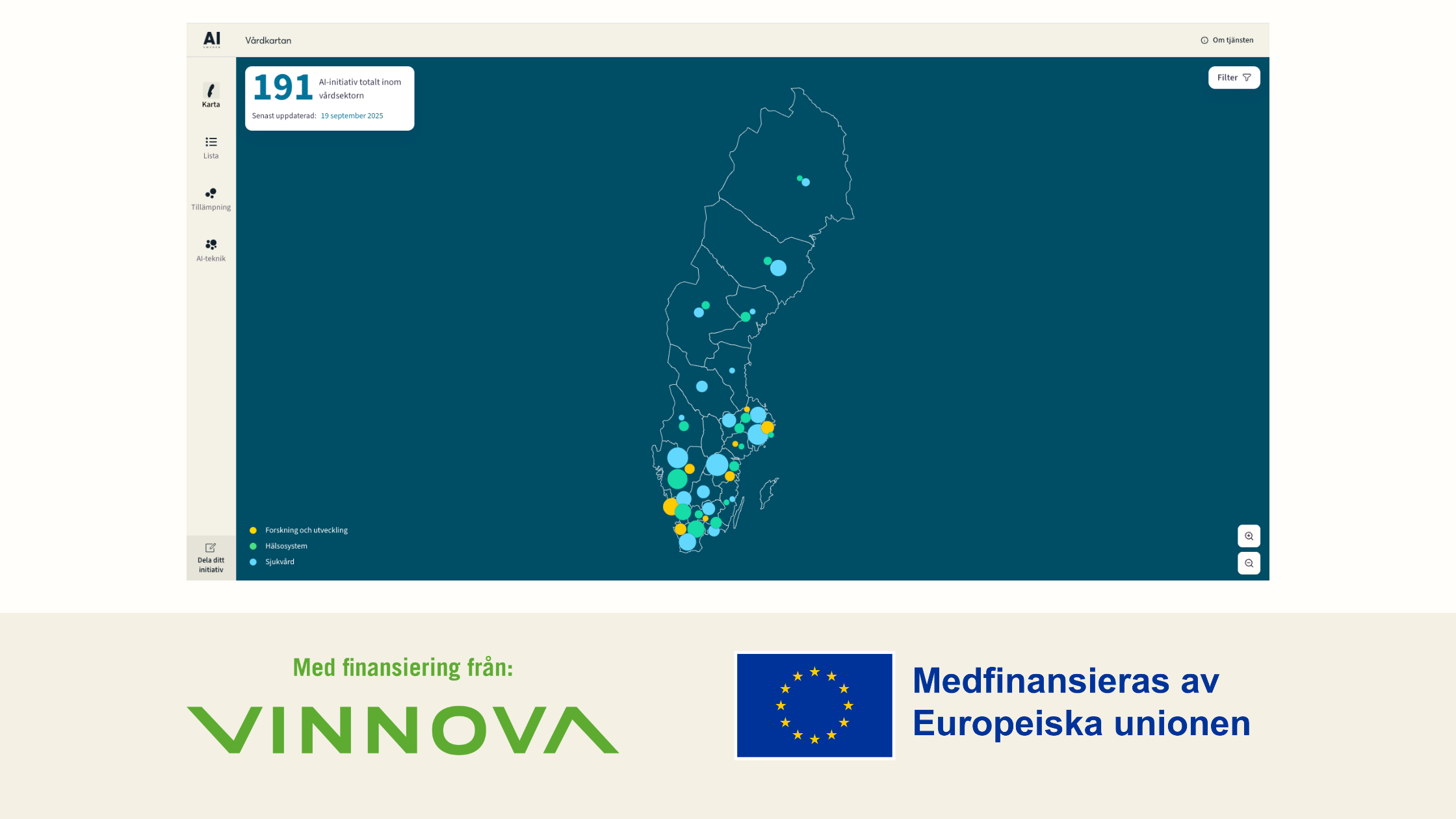 Utvecklingen av ’Vårdkartan’ har möjliggjorts genom medfinansiering från Europeiska regionala utvecklingsfonden under projektet Ökad nationell samverkan för accelererad användning av AI i alla branscher samt medfinansiering från Vinnova genom projekten Informationsdriven vård och ”Use Case Factory”. |