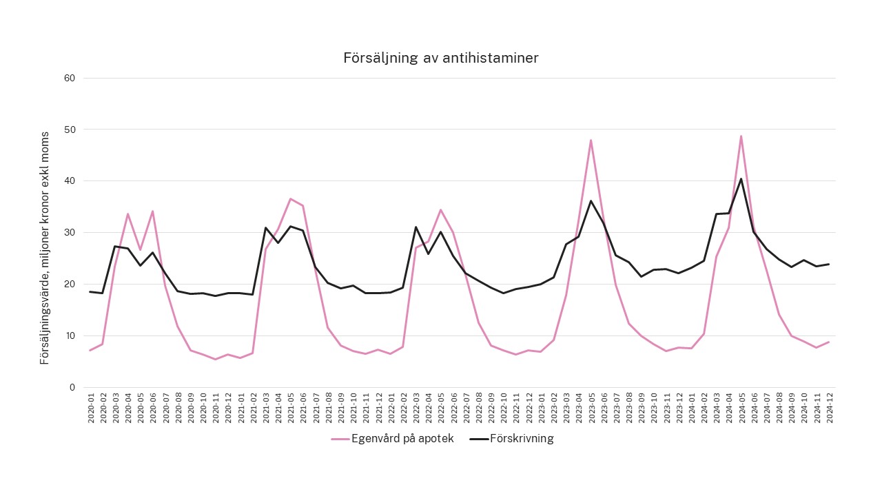 Receptfria antihistaminer såldes för cirka 210 miljoner kronor under 2020, jämfört med cirka 240 miljoner kronor under 2024, vilket innebär en ökning med 14 procent. Då ingår läkemedel som säljs på andra ställen än apotek, till exempel livsmedelsbutiker.