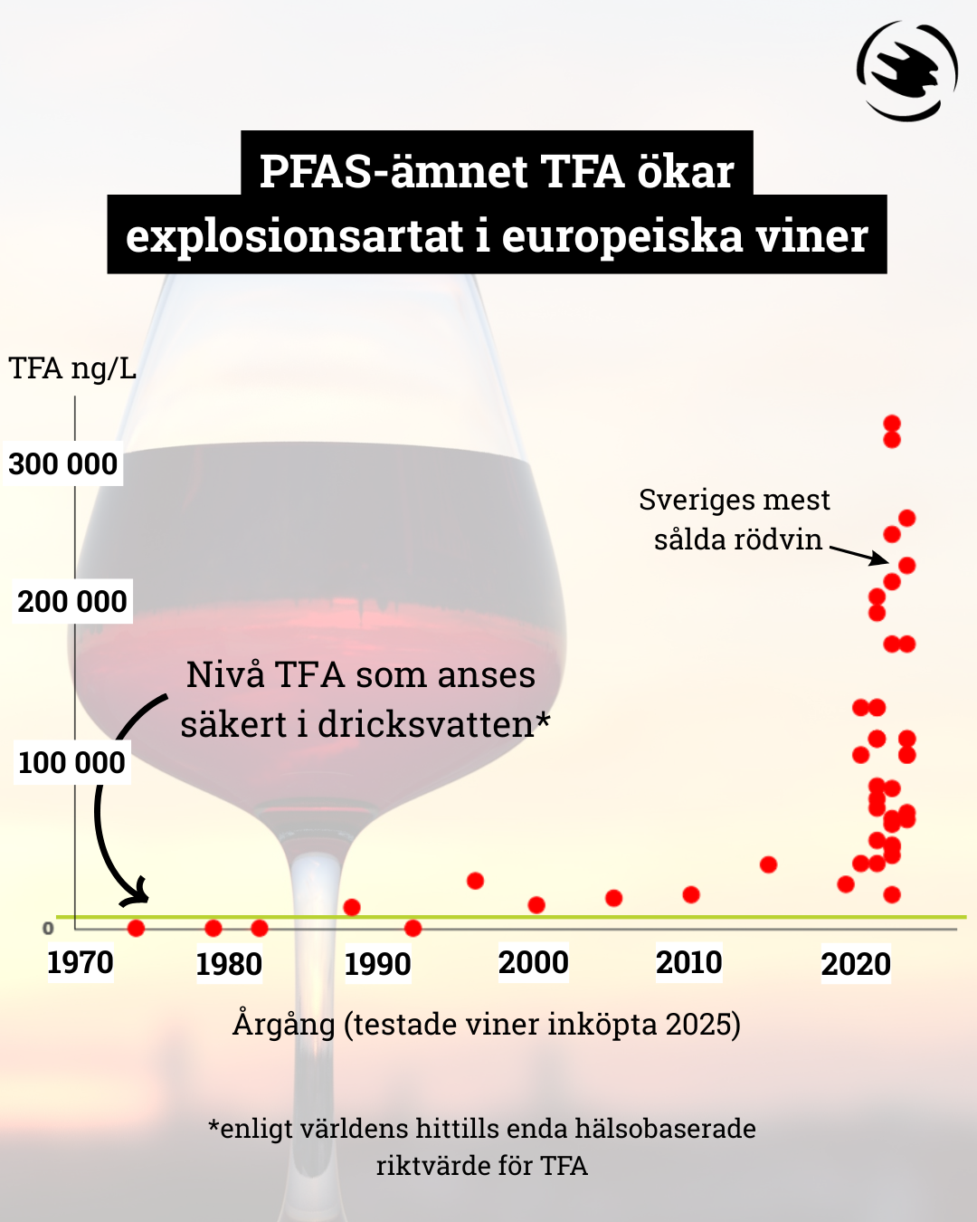 Studien som presenteras idag är ett samarbete mellan europeiska miljöorganisationer inom nätverket PAN Europe. 49 olika röda och vita viner har analyserats och resultatet är skrämmande: nivåerna av TFA har ökat dramatiskt i vin under det senaste årtiondet. Medan äldre viner från före 1988 inte innehåller TFA överhuvudtaget, sker en dramatisk ökning från 2020 och framåt – dessa viner innehåller mellan 21 000 och 320 000 nanogram TFA per liter.
