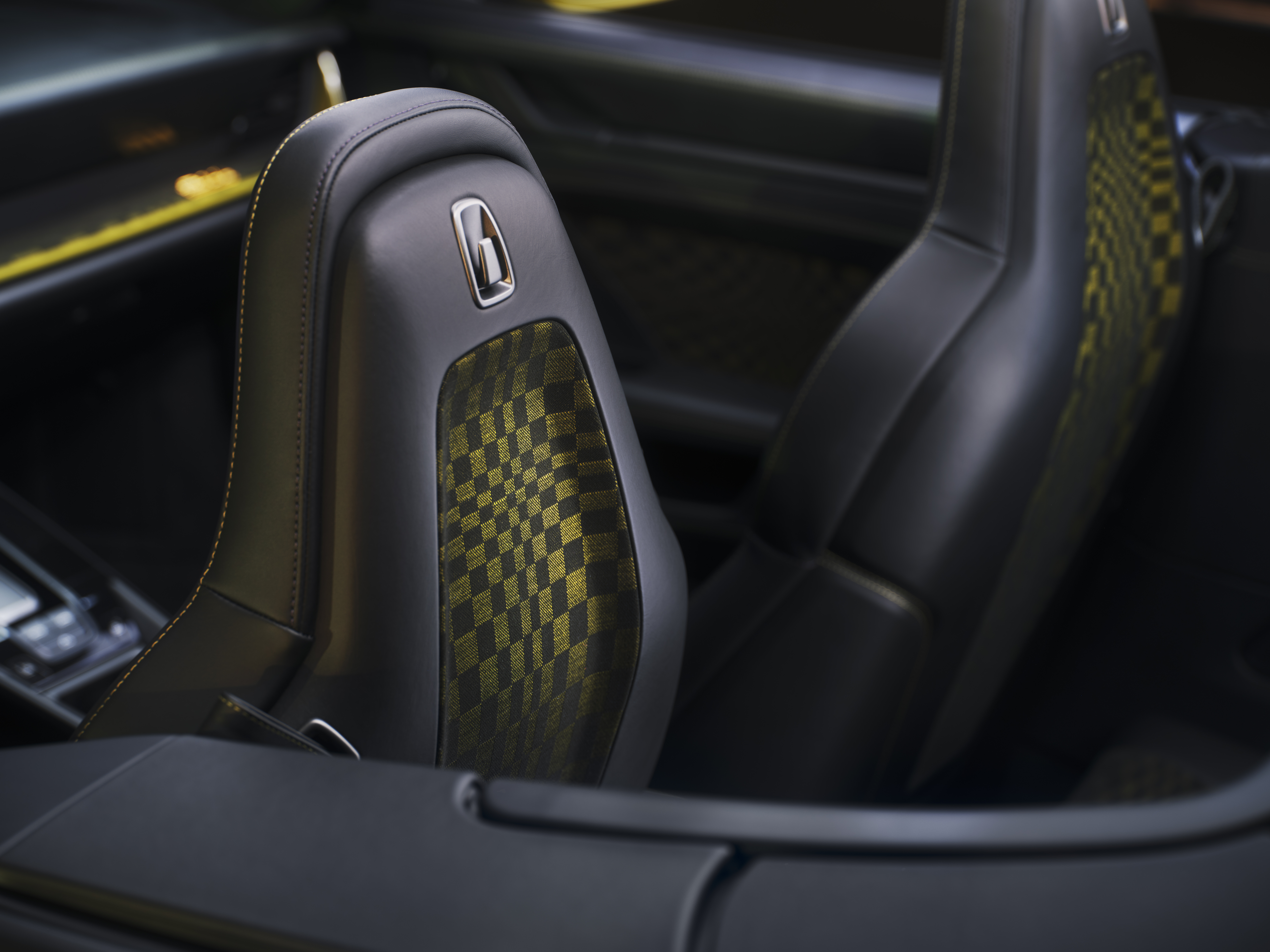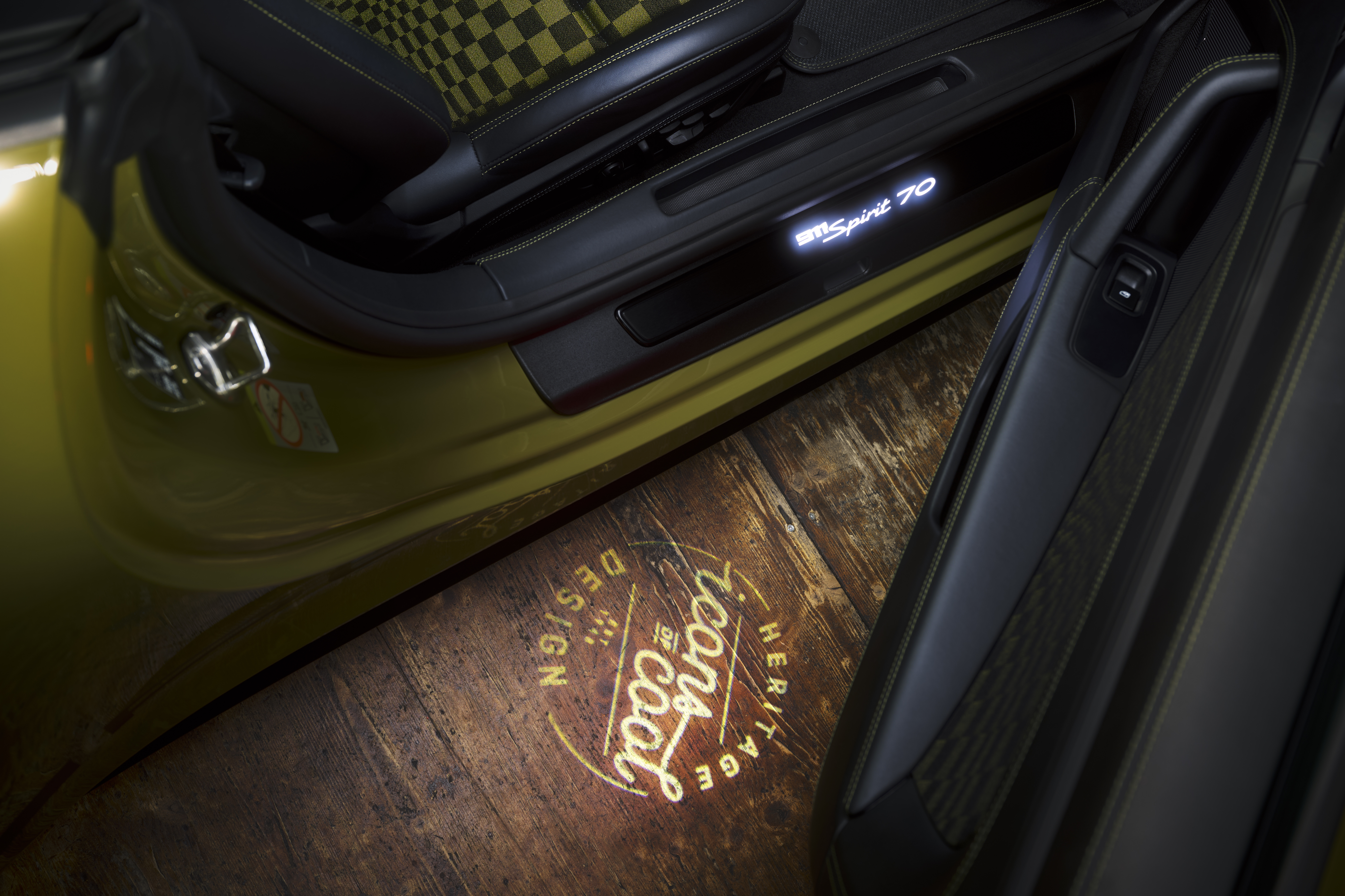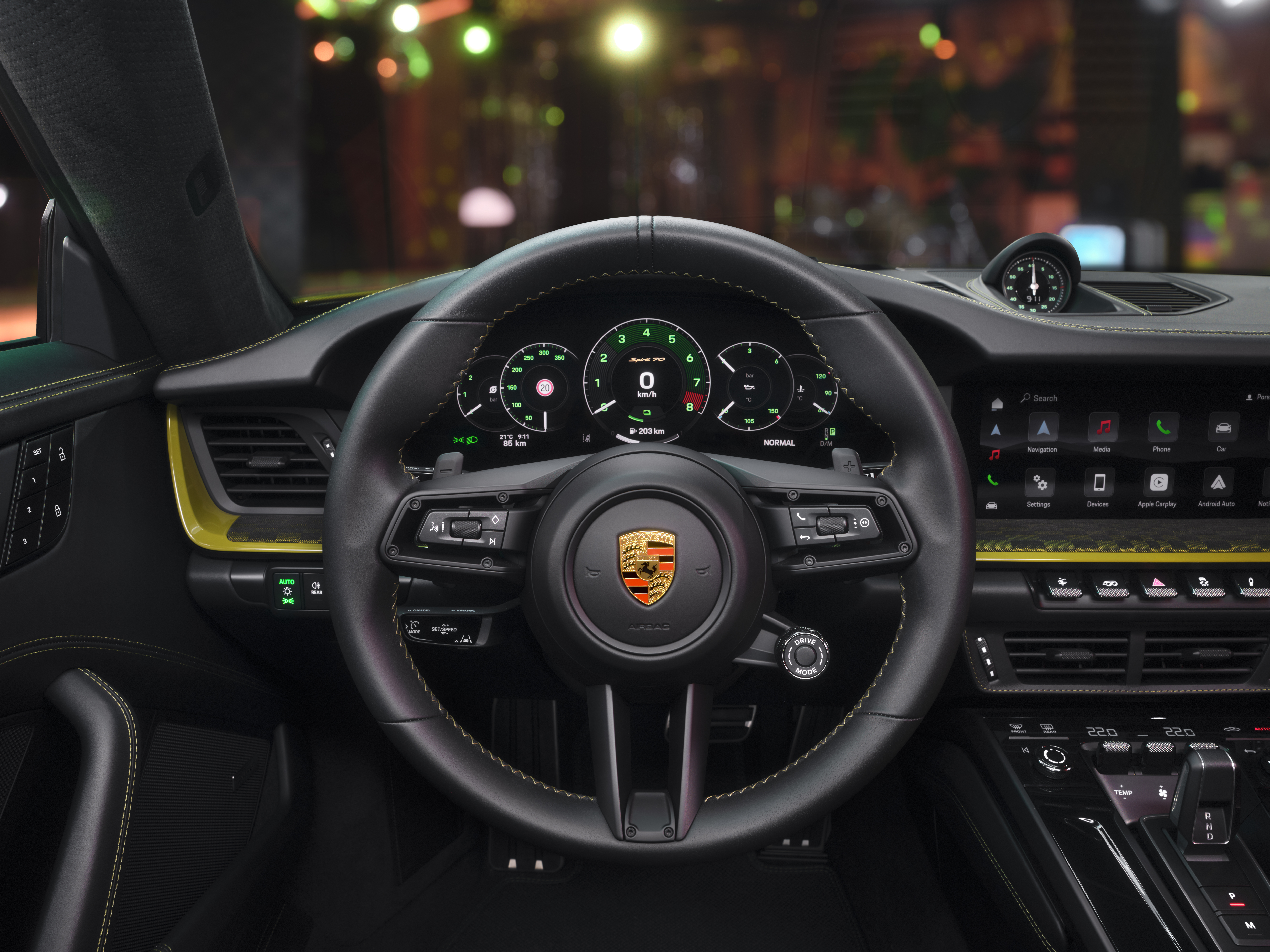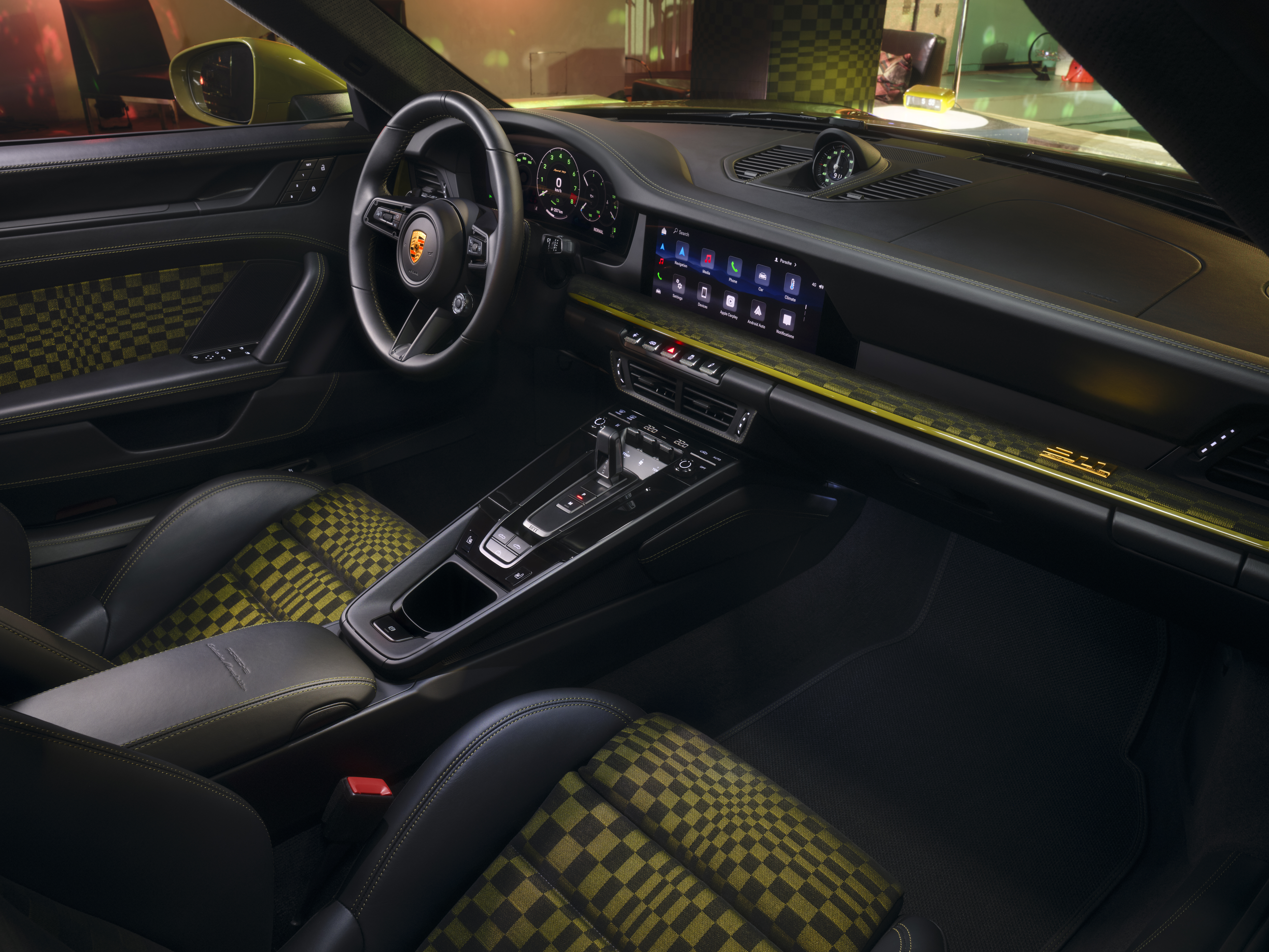 Interiörens höjdpunkt är det ikoniska tygmönstret Pasha i Black/Olive Neo. Tygets grafiska design påminner om en rutig flagga i rörelse. Olika stora, smart arrangerade rektanglar skapar en slags rörelse i mönstret. I stället för jacquardvelour som användes förr kombinerar 911 Spirit 70 ett tyg med flockgarn. Det ger tyget en ännu sportigare karaktär, en förbättrad känsla och mer komfort, särskilt på längre resor.