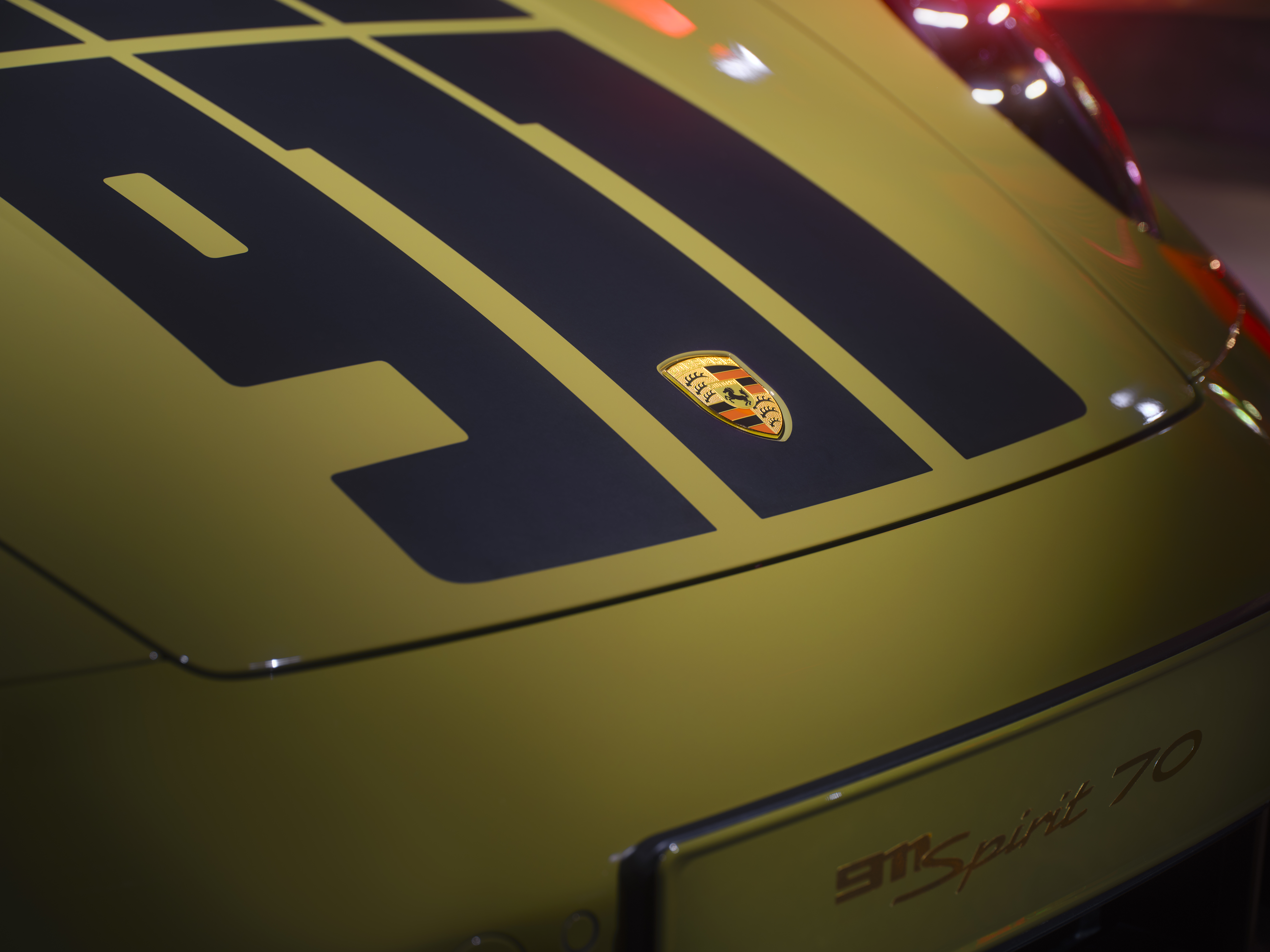 Ett exempel på kontrasten mellan tradition och innovation finns på mitten av den främre huven: Där bär 911 Spirit 70 ett Porsche-emblem som är nästan identiskt med det historiska emblemet från 1963. Vidare sitter det guldfärgade ”Porsche Exclusive Manufaktur”-emblem på framskärmarna. Avslutningsvis sitter ett Porsche Heritage-emblem på gallret på motorhuven. Designen påminner om märket på Porsche 356, som delades ut på 1950-talet när 100 000-kilometersmarkeringen nåddes. Andra ovanliga detaljer är den guldfärgade Porsche-inskriptionen och modellbeteckningen på bakpartiet. Den galvaniserade och guldpläterade ytan ger texten dess extraordinära lyster.