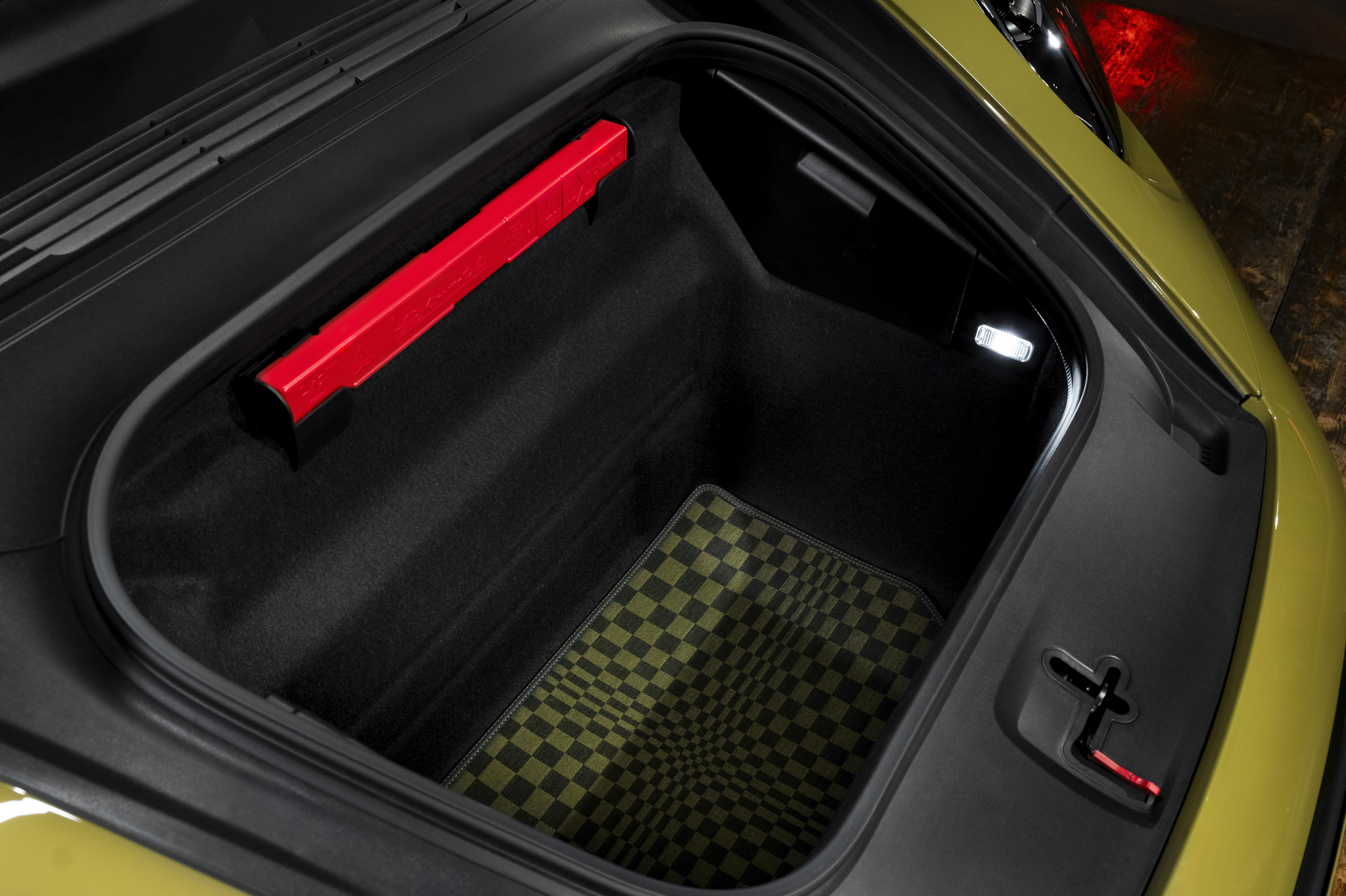 Mittsektionerna på de 18-vägs elinställbara sportstolarna, dörrpanelerna och till och med insidan av handskfacket är klädda i Pasha-mönster. Dekorinläggen på ryggstöden och panelen på instrumentpanelen finns även i Pasha som tillval. I grundutförandet ingår också en vändbar bagagerumsmatta i Pasha. Även den eleganta Clubläder-klädseln i Basalt Black med kontrastsömmar i Olive Neo och Clubläder-interiörpaketet i Basalt Black ingår som standard.