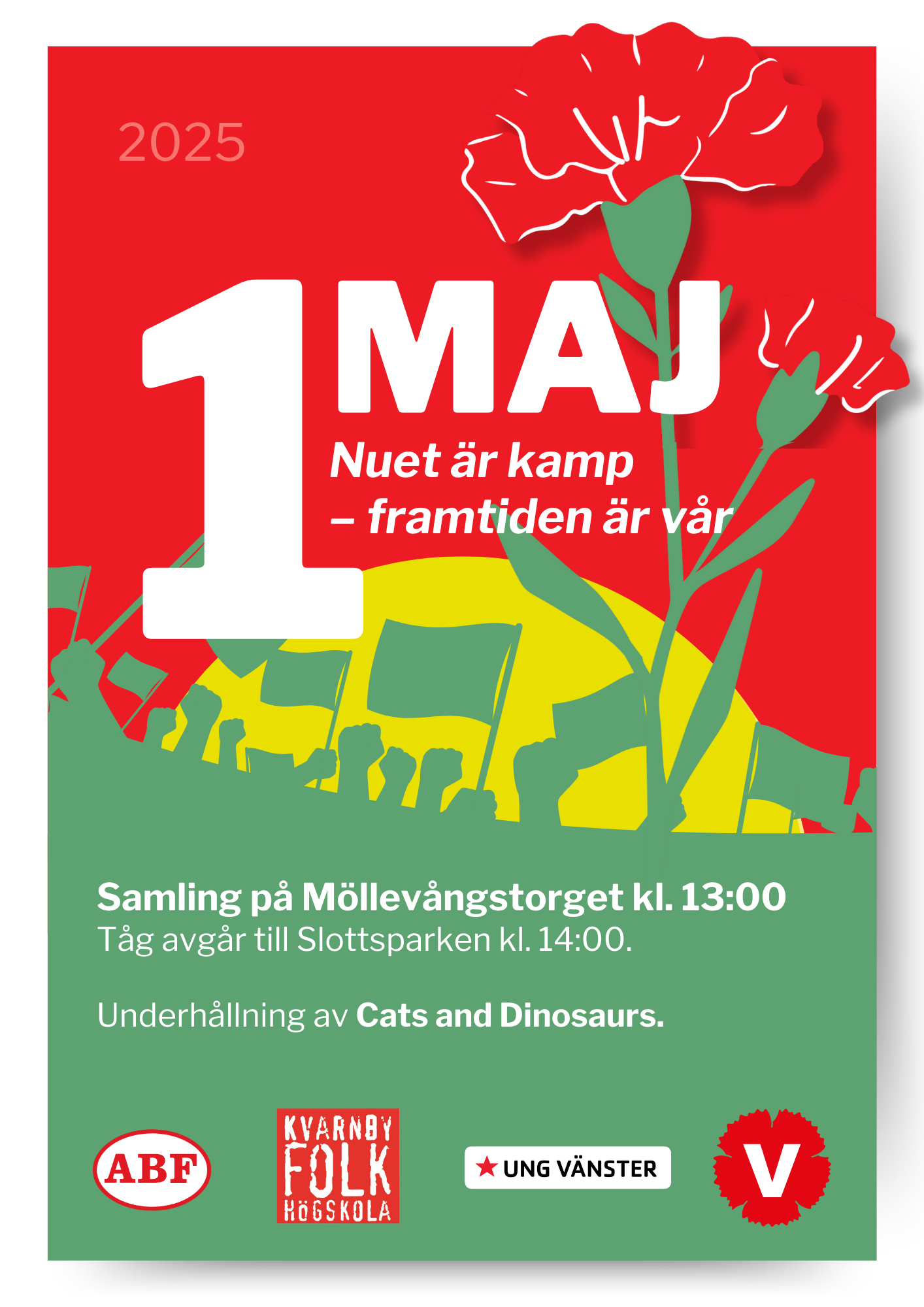 Vänsterpartiet Malmö och Ung Vänster Malmö demonstrera i år under parollen Nuet är kamp – framtiden är vår. Det blir musik och tal, i Slottsparken finns matförsäljning, hoppborg och annat kul för stora och små. Samling kl 13.00 Möllevångstorget. Tåg till Slottsparken avgår kl 14.00.