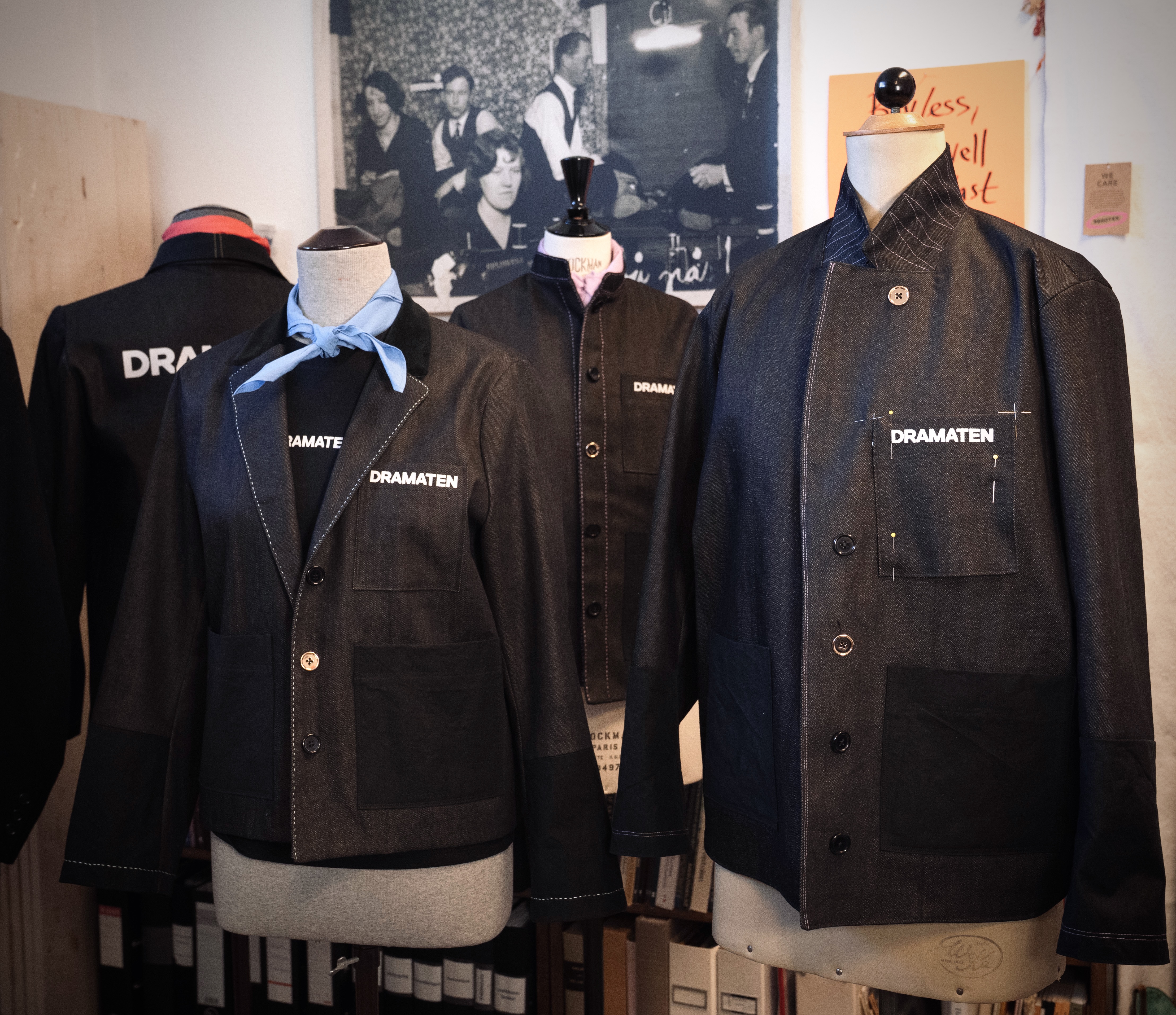 Dramatens 24 publikvärdar har fått nya skräddarsydda och måttanpassade arbetskläder. Kostymdesigner Nina Sandström har i samarbete med värdarna tagit fram en kollektion unika kavajer tillverkade i raw denim, överskott från industrin, så kallad dead stock.