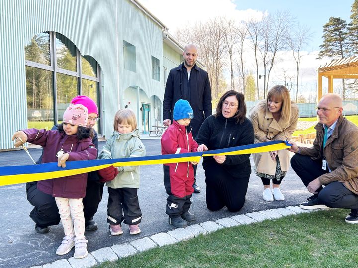 Efter inflyttning i slutet av sommaren har både barn och personal nu börjat finna sig till rätta i den nybyggda, gröna förskolan – som blivit ett välkommet nytillskott i det snabbt framväxande bostadsområdet Industristaden. Måndagen den 10 november klipptes invigningsbandet av förskolebarnen, som fick hjälp med saxarna av gästande kommunpolitiker, innan det bjöds på fika och rundtur.
