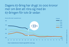 - Medelinkomsttagaren har vid 67 års ålder 87 procent av inkomsten vid 60 år och har cirka 22 600 kr i månaden efter skatt att röra sig med.