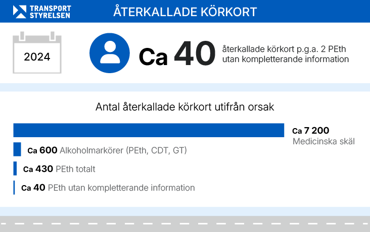 Med anledning av den pågående debatten har myndigheten fattat beslut om att låta en sektion med utredare manuellt gå igenom körkortsåterkallelser för 2024 och kartlägga omfattningen av återkallelser på grund av två förhöjda PEth-värden. Resultatet visar att det i cirka 430 fall med körkortsåterkallelser funnits uppgifter om förhöjda PEth-värden. Men i de flesta av de ärendena fanns också en ställd diagnos om beroende, missbruk eller andra omständigheter som rapporterats av läkare. I cirka 40 ärenden har återkallandet av körkortet skett utifrån två PEth-tester som överskridit gränsvärdena utan kompletterande information från läkare. I majoriteten av dessa ärenden har gränsvärdet på 0,3 mikromol/l överskridits med marginal.