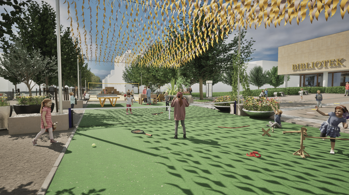 Här skapas en levande mötesplats som uppmuntrar till både spontan rörelse och planerade aktiviteter. Där kommer invånare och besökare kunna ta del av bland annat beachvolleyboll, tennis, badminton, pingis och foosball. Dessutom planeras en cykel- och skateslinga samt en mindre hinderbana för den som söker lite extra utmaning. I samarbete med Fritidsbanken kommer det att vara möjligt att låna utrustning, som bollar och racket, gratis på biblioteket under dess öppettider.
