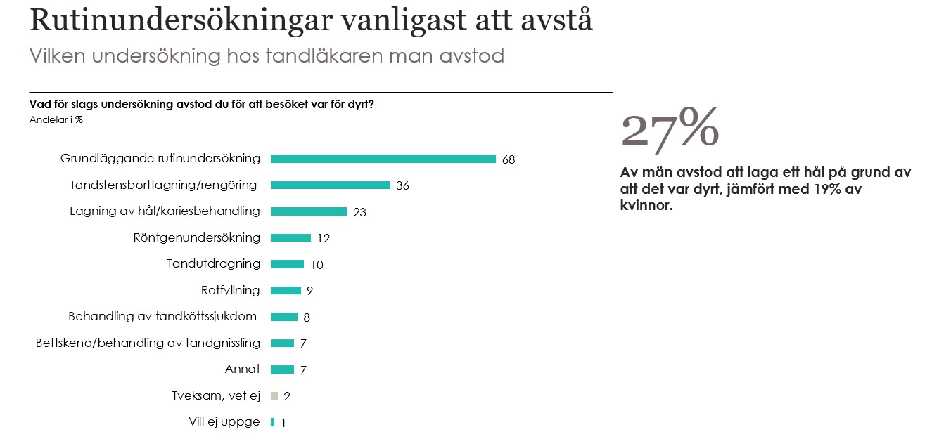 En helt ny Sifo-undersökning (Verian) visar att 3 av 10 skåningar någon gång avstått tandvård för att de inte har råd. Av dessa svarar 27 procent av männen och 19 procent av kvinnorna att de av kostnadsskäl låtit bli att laga ett hål.