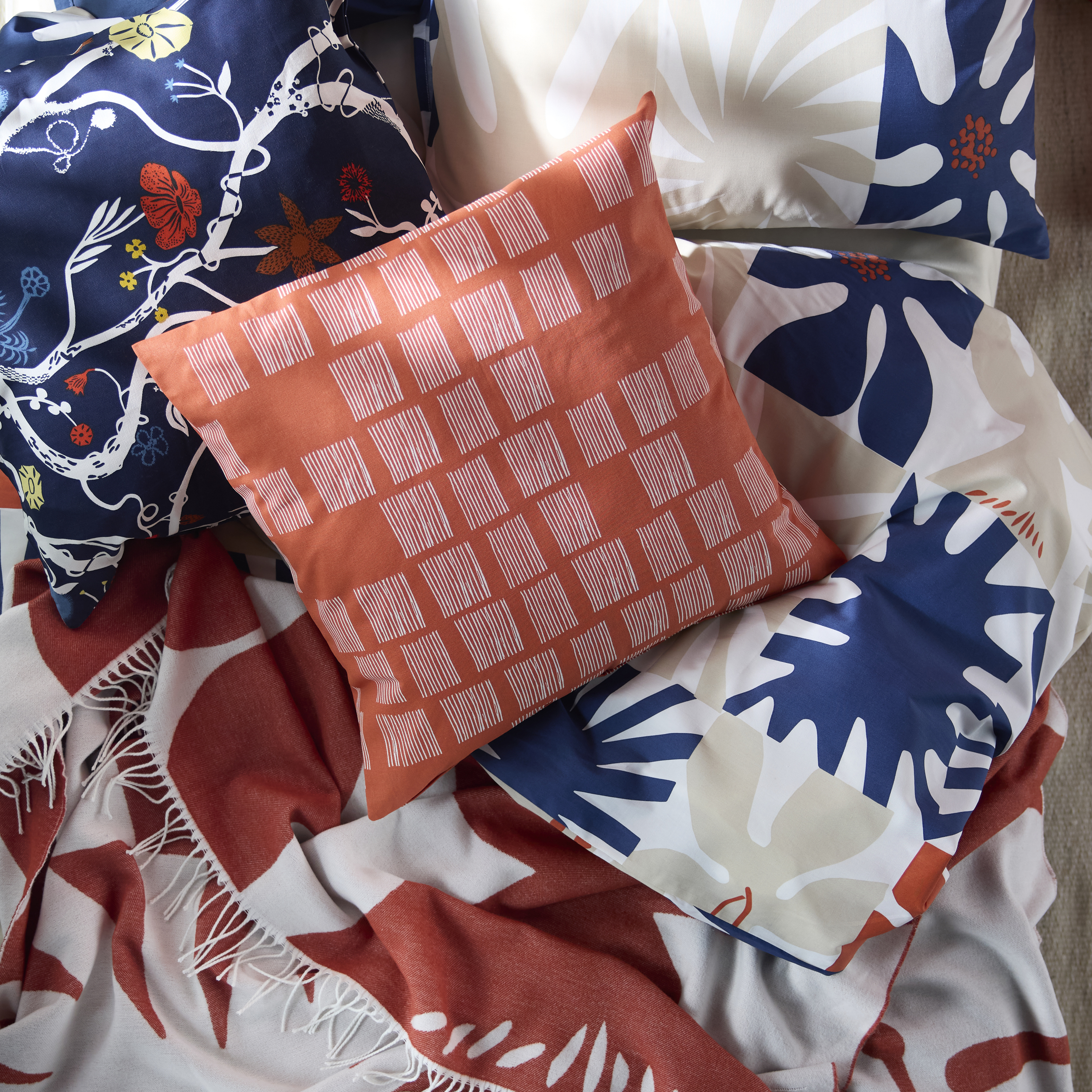 Vem kan motstå en tidlös blandning av skandinaviska färger och mönster? Ta med dig den mysiga charmen i en svensk stuga till ditt hem med pläd och påslakan HYLSNEJLIKA i livfulla nyanser av orange, rött och blått och kuddfodralet PALPLJUNGMAL matchar fint.