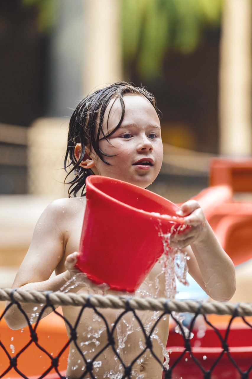 Det nya barnområdet i Aquadome är fullt av lekfulla vattenupplevelser: en trygg och mysig babypool med rutschkana och leksaker, en varmvattenpool med utsikt över grönskan utanför, och en sprudlande fontänpark på 250 m² där vattenstrålar dansar i alla riktningar. Här kombineras lek och trygghet i en miljö där hela familjen kan njuta – med närhet till både omklädningsrum och viloplatser.