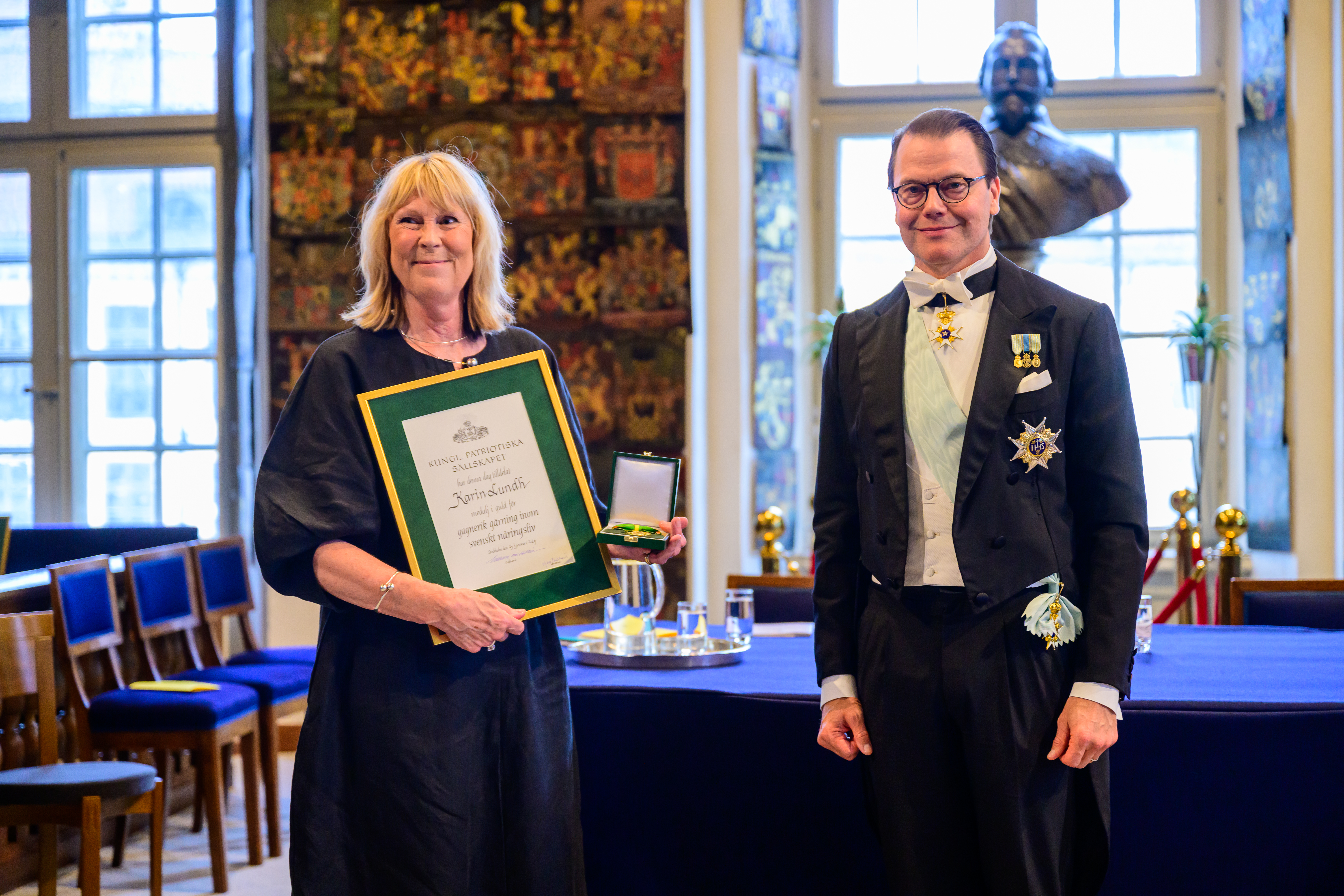 Nio medaljer utdelades under Kungl. Patriotiska Sällskapets årshögtid den 21 maj på Riddarhuset. H.K.H. Prins Daniel överlämnade medaljerna. Katarina Olsson, professor emerita i civilrätt vid Lunds universitet, tilldelas Medalj för betydande gärning för hennes mångskiftande insatser för stiftelsesverige.