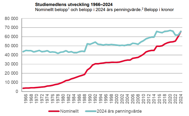 Men till 2024 och 2025 höjdes prisbasbeloppet ordentligt för att spegla kostnadsutvecklingen i samhället, och då höjdes även studiemedlet. Mellan 2023 och 2024 höjdes studiemedlet med över nio procent, och mellan 2024 och 2025 med ytterligare cirka tre procent. Totalt höjdes det med cirka 2 500 kr för fyra veckors heltidsstudier från 2023 till 2025, och nu är köpkraften nästan återställd.
