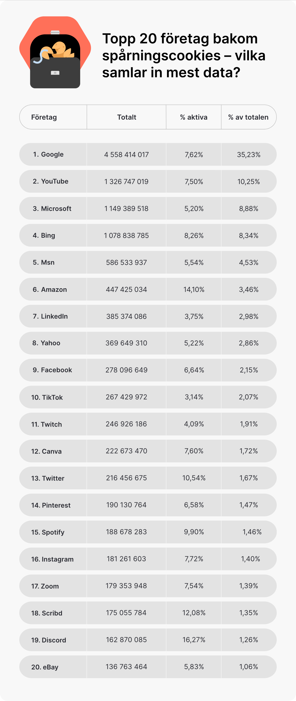 Hos Sverige som låg på plats 66 med 208 miljoner kakor var ”endast” 8,7 procent aktiva. En till synes låg siffra, men det motsvarar ändå 18 miljoner kakor som går att koppla direkt till användaraktivitet.