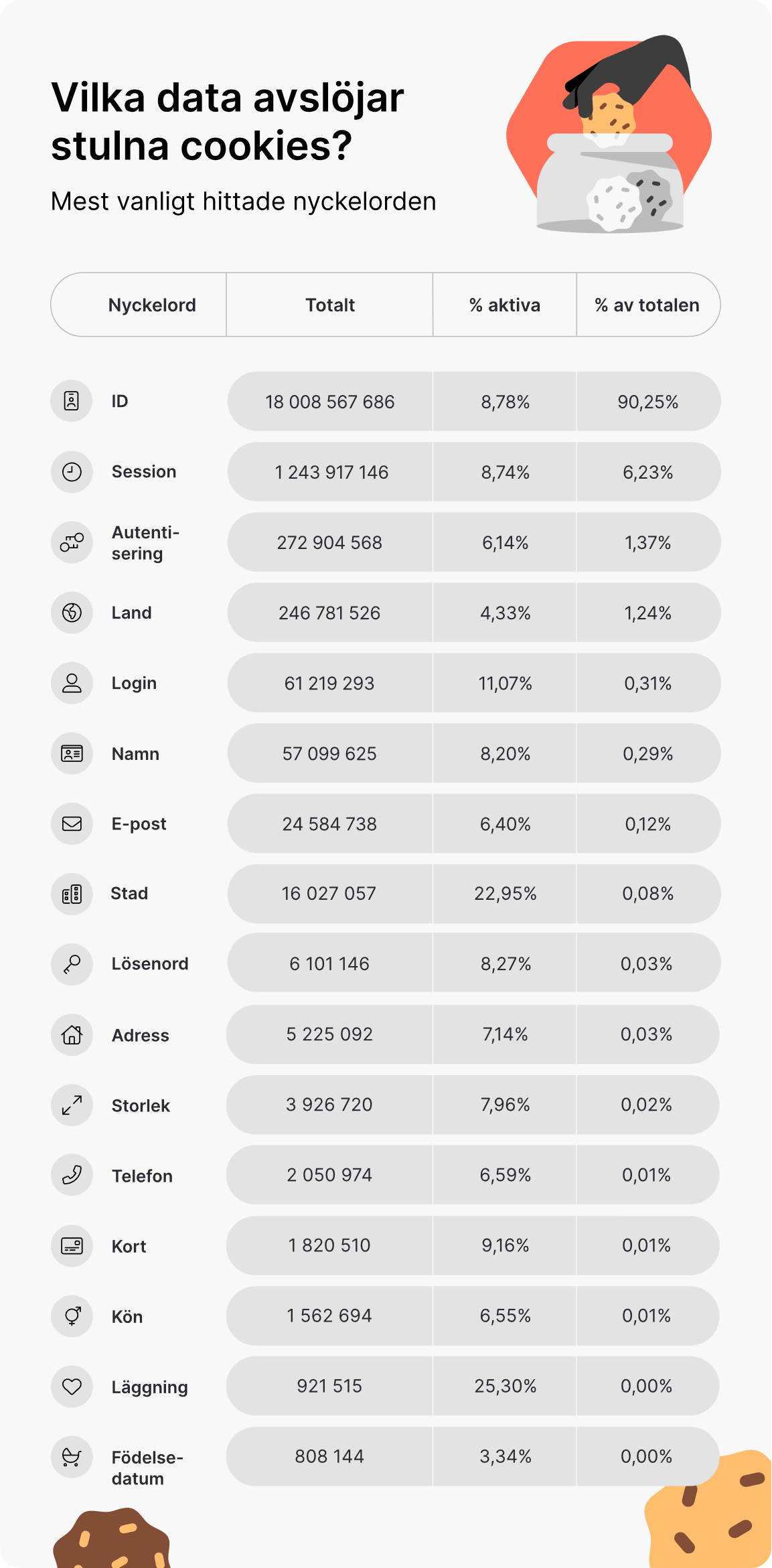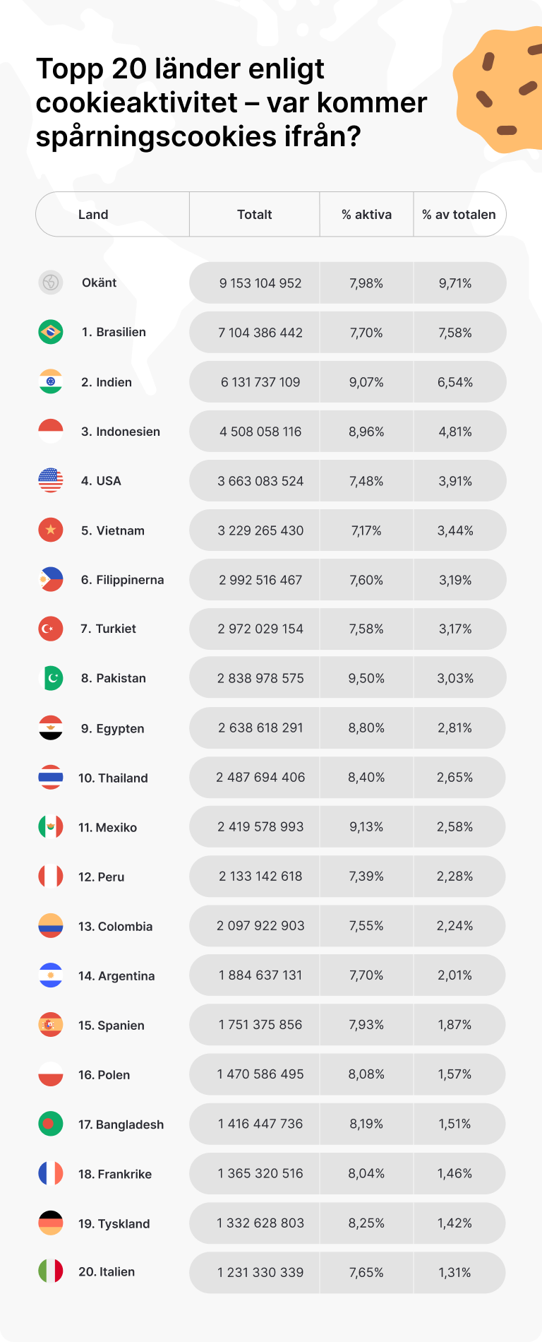 Sverige rankas på plats 66 av 253 länder, med över 208 miljoner läckta kakor – varav 18 miljoner fortfarande är aktiva och kopplade till verklig användaraktivitet.