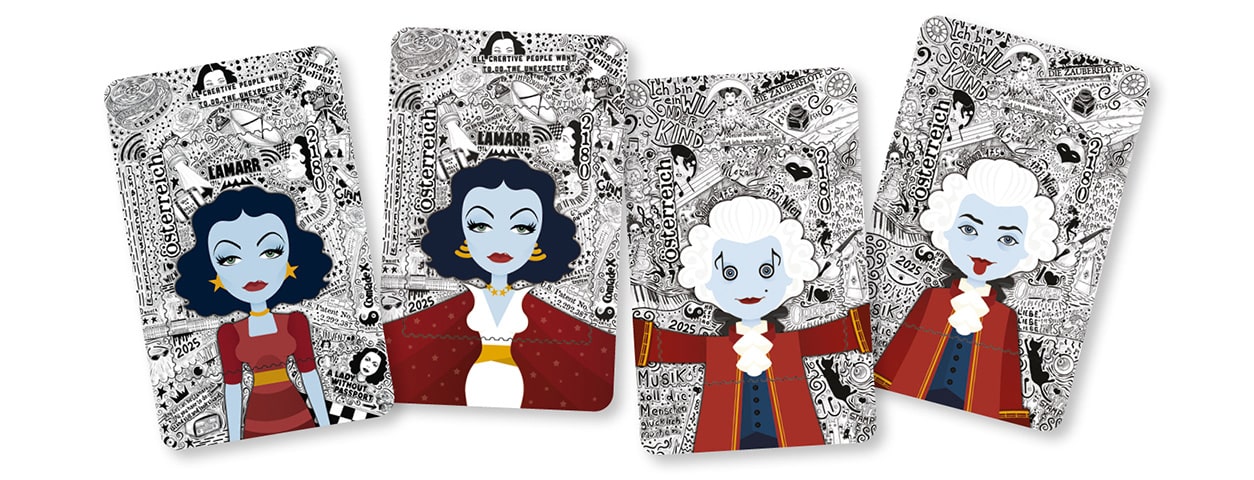 The new Crypto stamp art is dedicated to two extraordinary personalities from Austrian history: Wolfgang Amadeus Mozart and Hedy Lamarr. Both personalities embody ingenuity, creativity and the courage to break with convention. Hackatao interprets their complexity in four unique motifs: