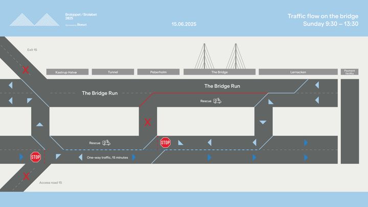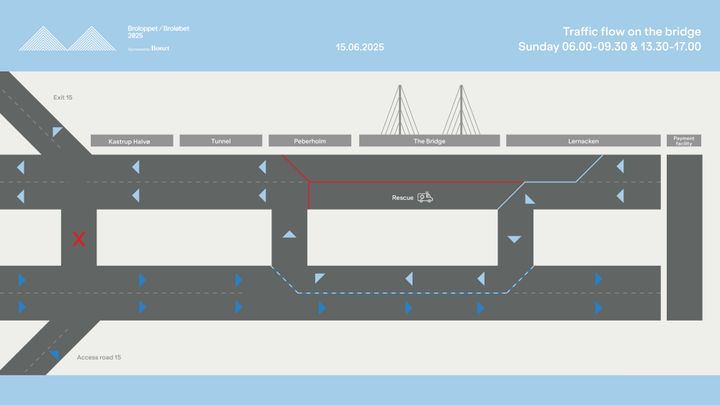 Øresundsbrons kapacitet är begränsad under Broloppet den 15 juni och kunder uppmanas att köra före klockan 06 eller efter klockan 17 om det är möjligt. För alla som behöver köra under Broloppet, i tidsperioden klockan 06-17, kommer bron att vara öppen med reducerad kapacitet, sänkt hastighet och förlängd restid.