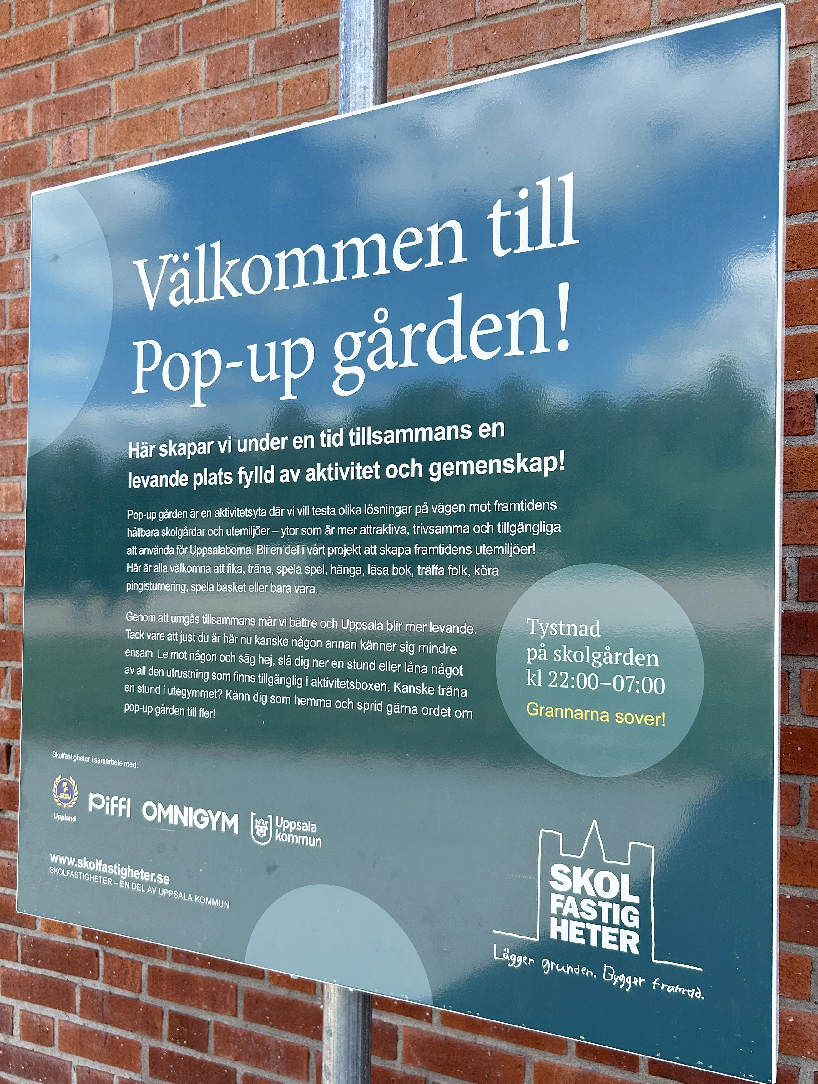 Skylt mot röd tegelvägg med texten "Välkommen till Pop-up gården!" och information om aktiviteter.