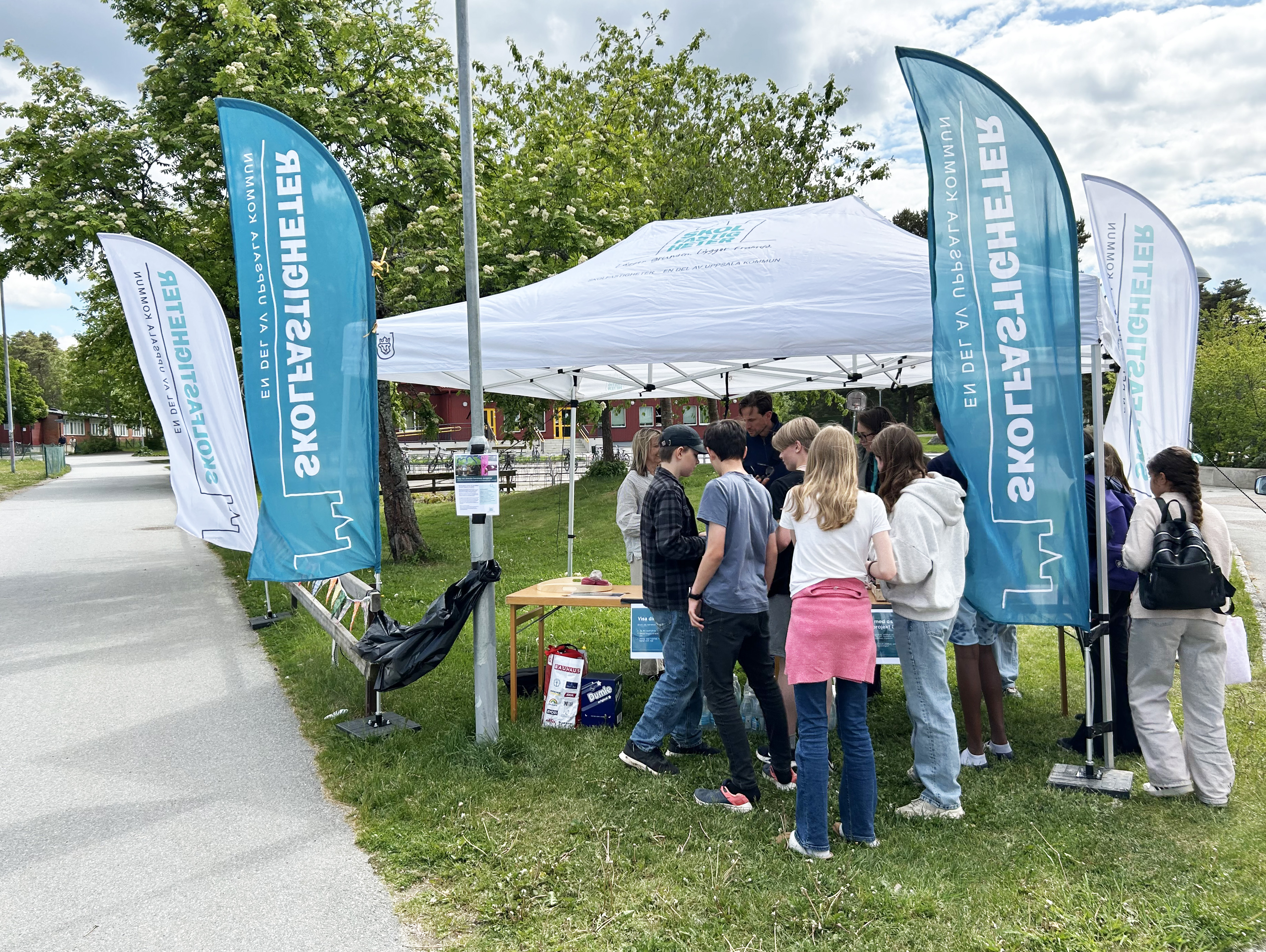 En grupp människor står under ett vitt tält med skyltar som visar texten "Skolfastigheter".