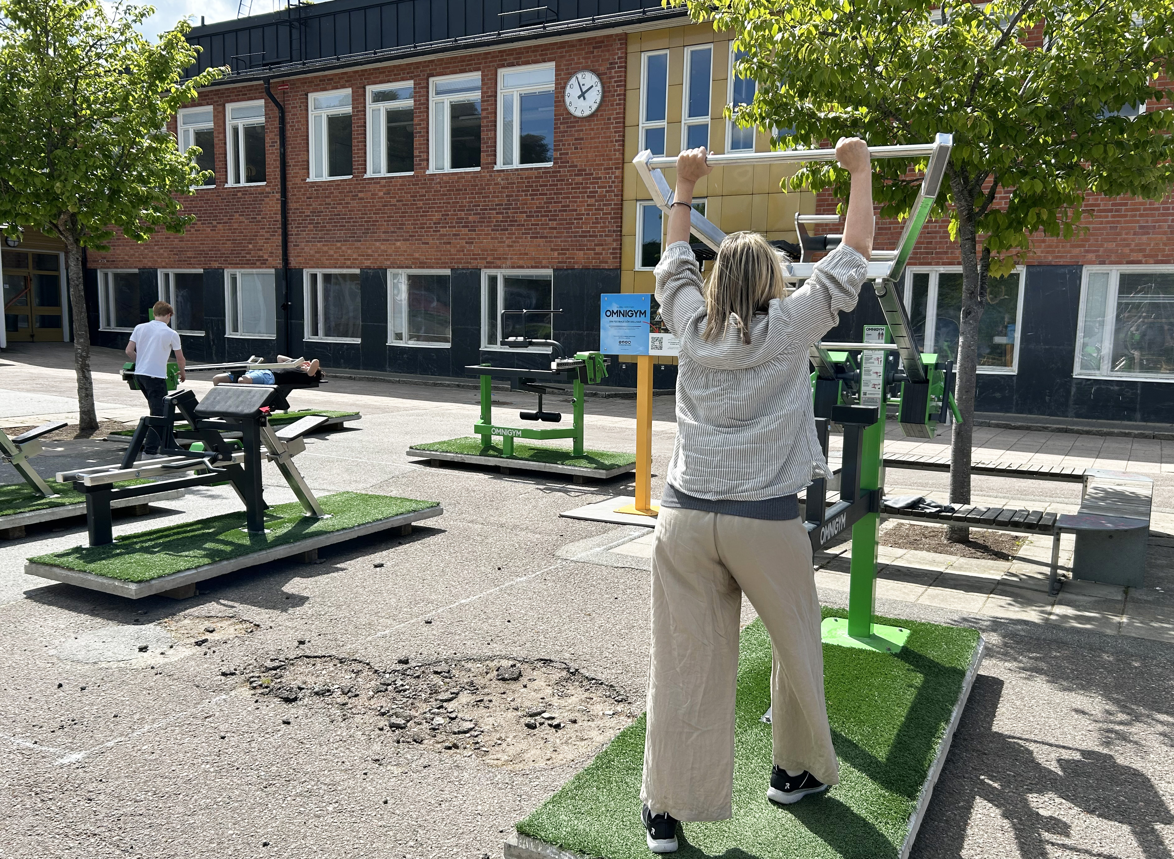 En person tränar på en utomhusgymanläggning framför en skolbyggnad.