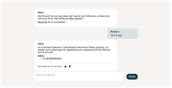 Albot hjälper Aleris medarbetare genom att snabbt och korrekt besvara frågor om exempelvis HR, lön, interna rutiner och administrativa processer. Assistenten är integrerad med Aleris intranät och dokumenthanteringssystem och utvecklas kontinuerligt utifrån användarnas behov och den data som medarbetarna själva lägger in.