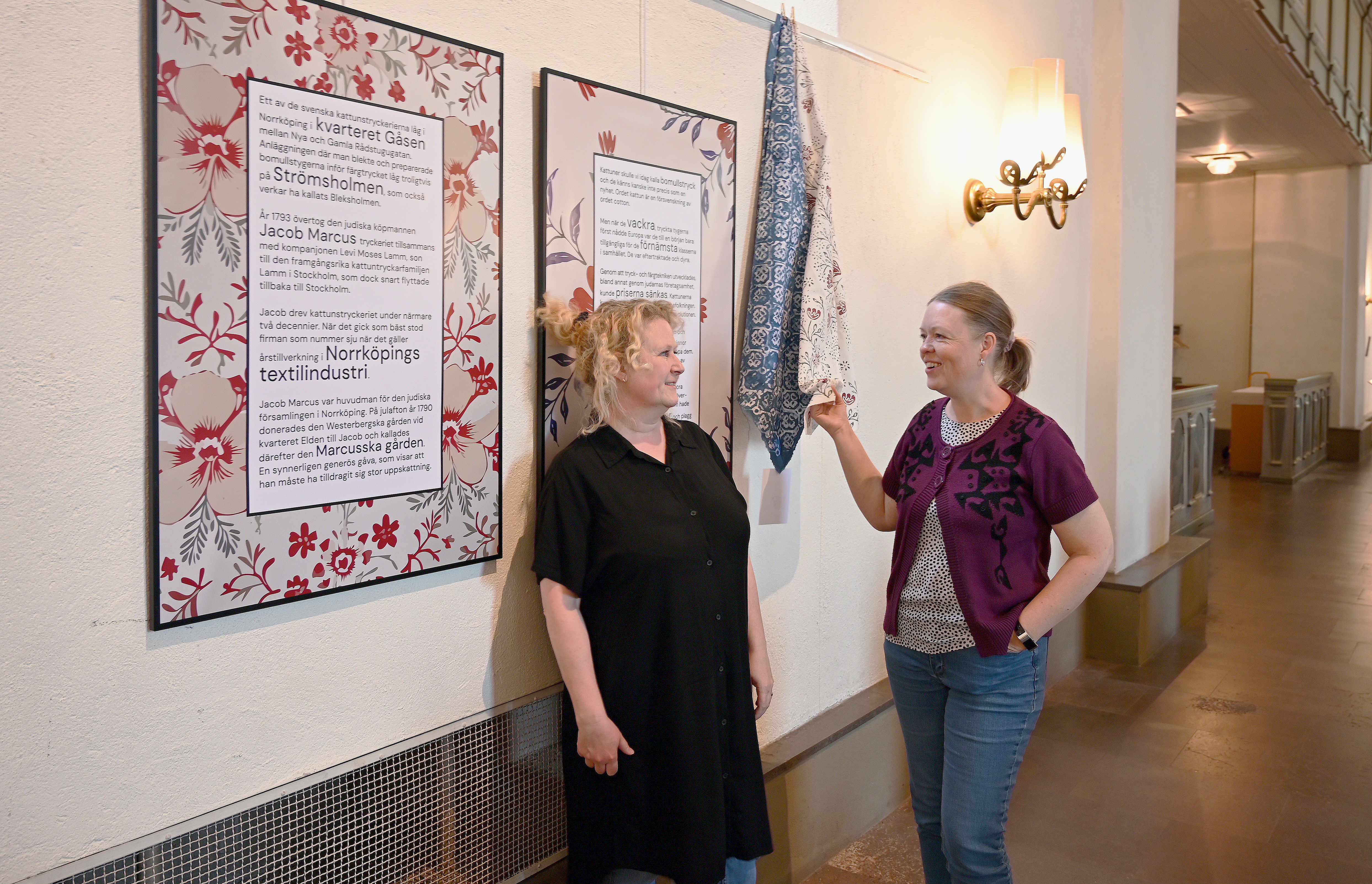 Annelie Tollerå och Christina Helander har arbetat med varsin del i jubileumsåret. I S:t Olai kyrka visas under sommaren utställningen I kattunfabrikernas spår. "Kattun" är ett äldre ord för bomullstryckt tyg. Annelie Tollerå vill lyfta fram hur judarnas historia i Sverige är nära förknippad med bomullstryckens storhetstid då de slog igenom och blev tillgängliga för bredare samhällsskikt.