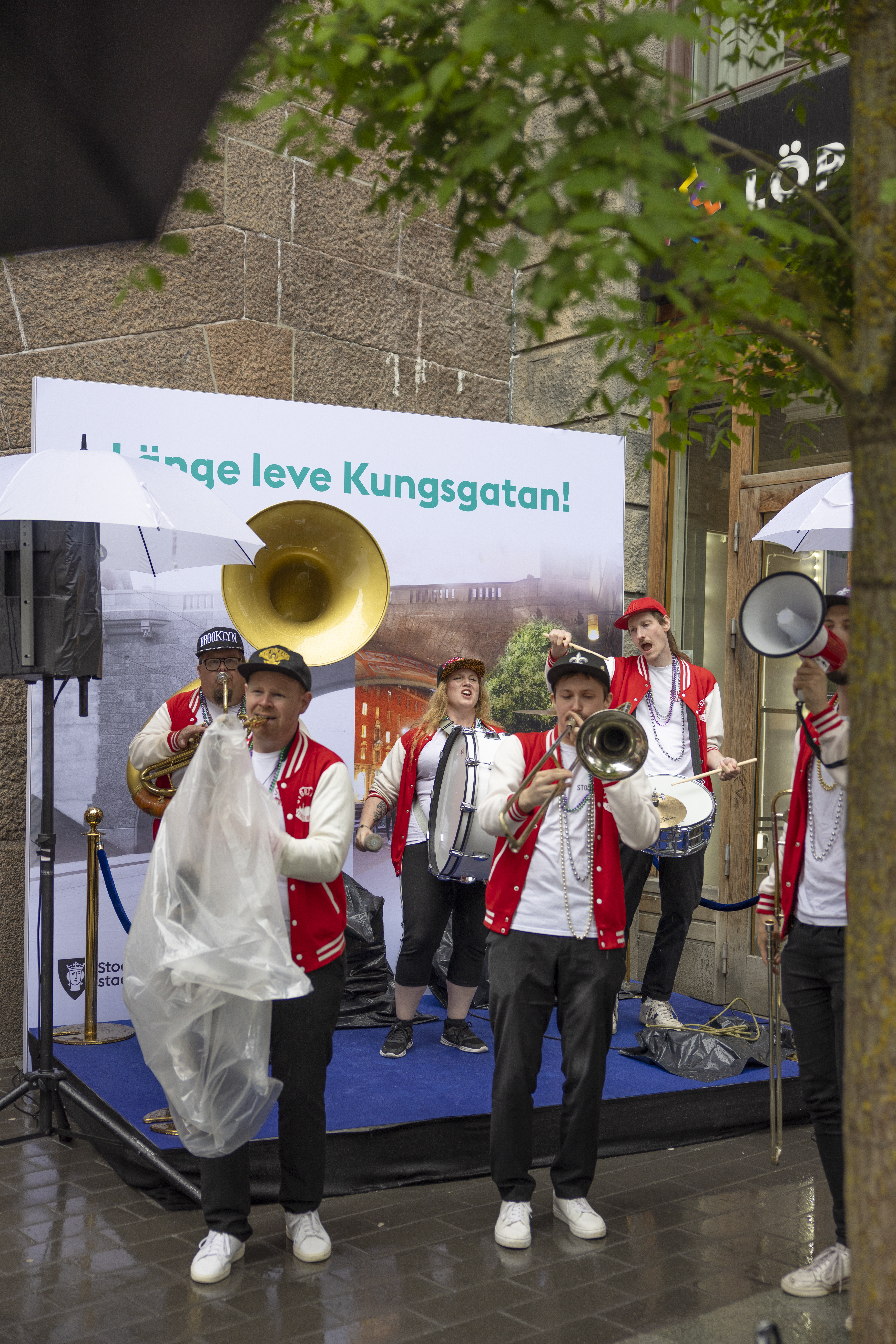 Vid öppningsceremonin framförde musikgruppen Tbaxtstan med Wille Crafoord låten Kungsgatan – om gatans historia. Kungsgatanlåten är nyligen släppt på ett nytt album och är en del i Wille Crafoords pågående projekt med att skriva 100 låtar om Stockholms historia. Bandet Storstan Street Brass spelade medryckande musik längs hela gatan både på och efter invigningen.