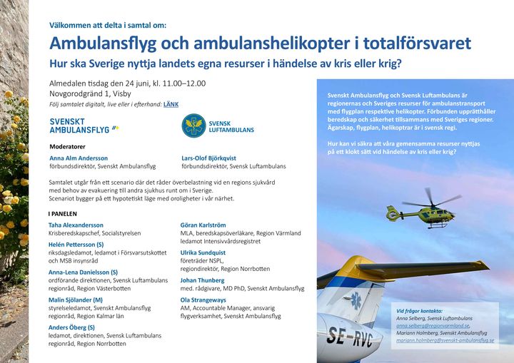 Svenskt Ambulansflyg och svensk Luftambulans bjöd in till seminarium och samtal om ambulansflyg och ambulanshelikopter i totalförsvaret. Det genomfördes tisdag den 24e juni, 11.00.