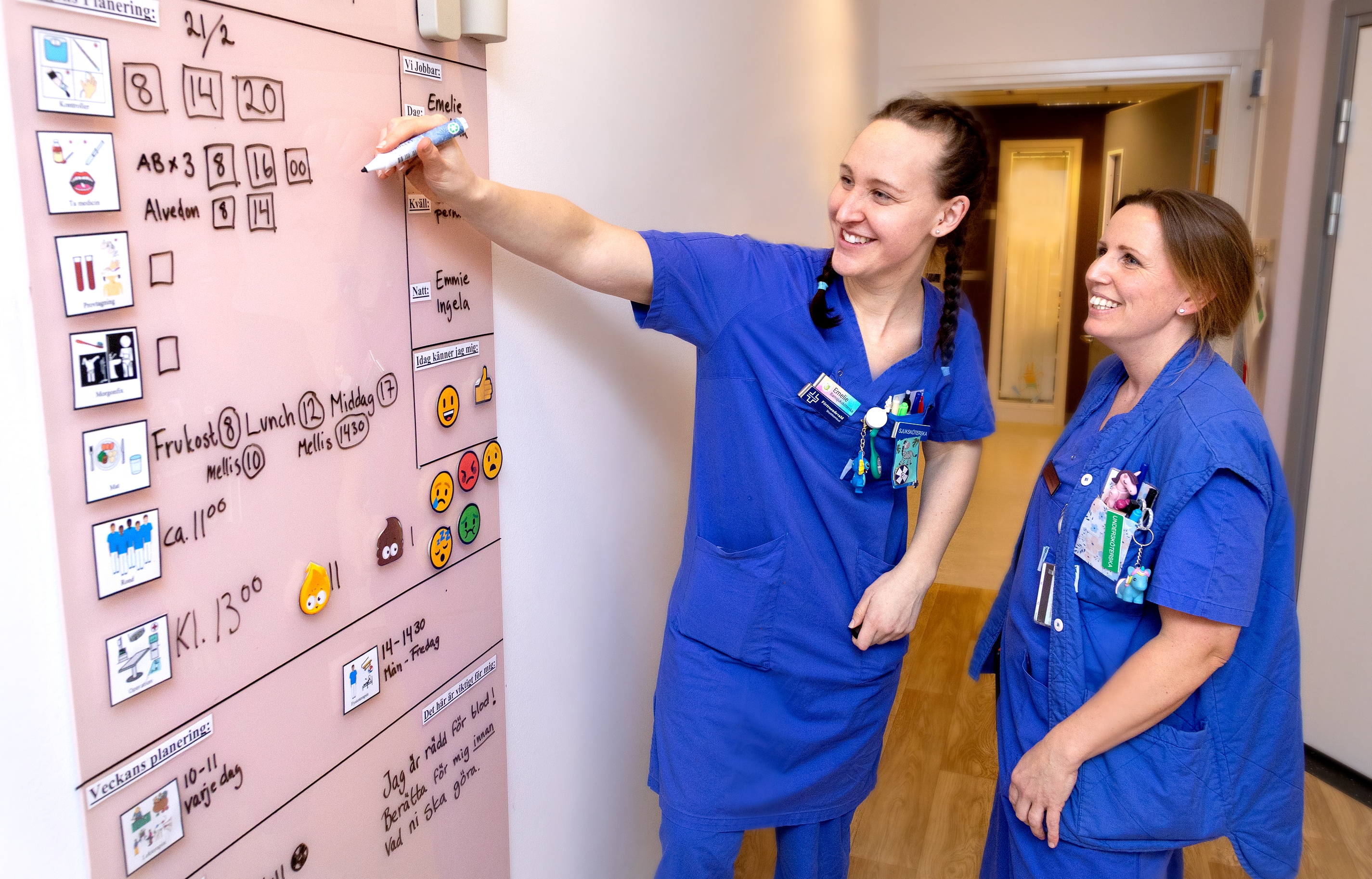 Barnsjuksköterskan Emelie Bergh och specialistundersköterskan Evelina Grünert står framför en av de 21 glastavlor som monterats på väggarna i varje patientrum på barn- och ungdomsmedicins slutenvårdsavdelning i Skövde och som började användas i december 2024. Den kan vara full av handskrivna meddelanden om allt från tid för undersökningar och när det är dags att äta till vad den unge patienten gillar eller är rädd för eller kanske inte vill prata alls. Där finns även olika smileys som utan ord beskriver om patienten är ledsen, arg eller glad.