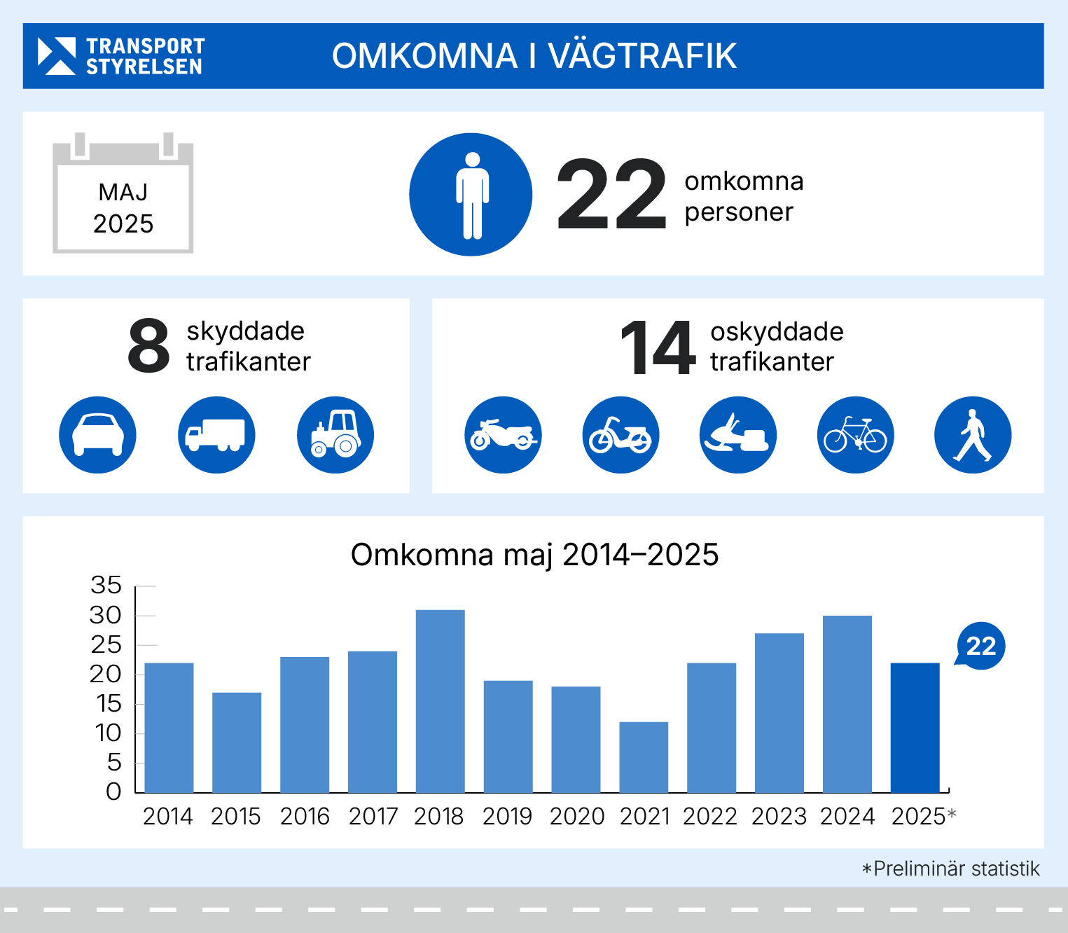 Under perioden januari–maj 2025 miste 68 personer livet i trafiken, vilket är en mindre än samma period året innan. Under maj miste 22 personer livet i trafiken, 16 män och 6 kvinnor. Det visar preliminära uppgifter som sammanställts av Transportstyrelsen.