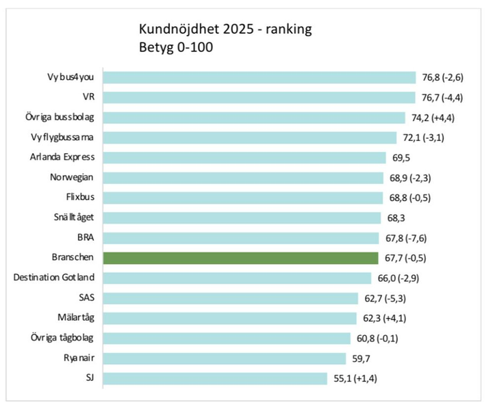 Vy bus4you får 76,8 poäng, jämfört med branschens 67,7.