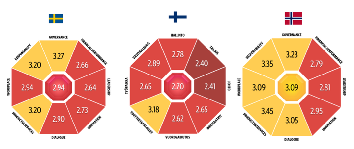BILDER: Nordisk studie om anseende och förtroende i vård och omsorg 2025. Studien undersökte det övergripande anseendet för organisationer verksamma inom den privata och offentliga sektorn bland finländare, svenskar och norrmän.