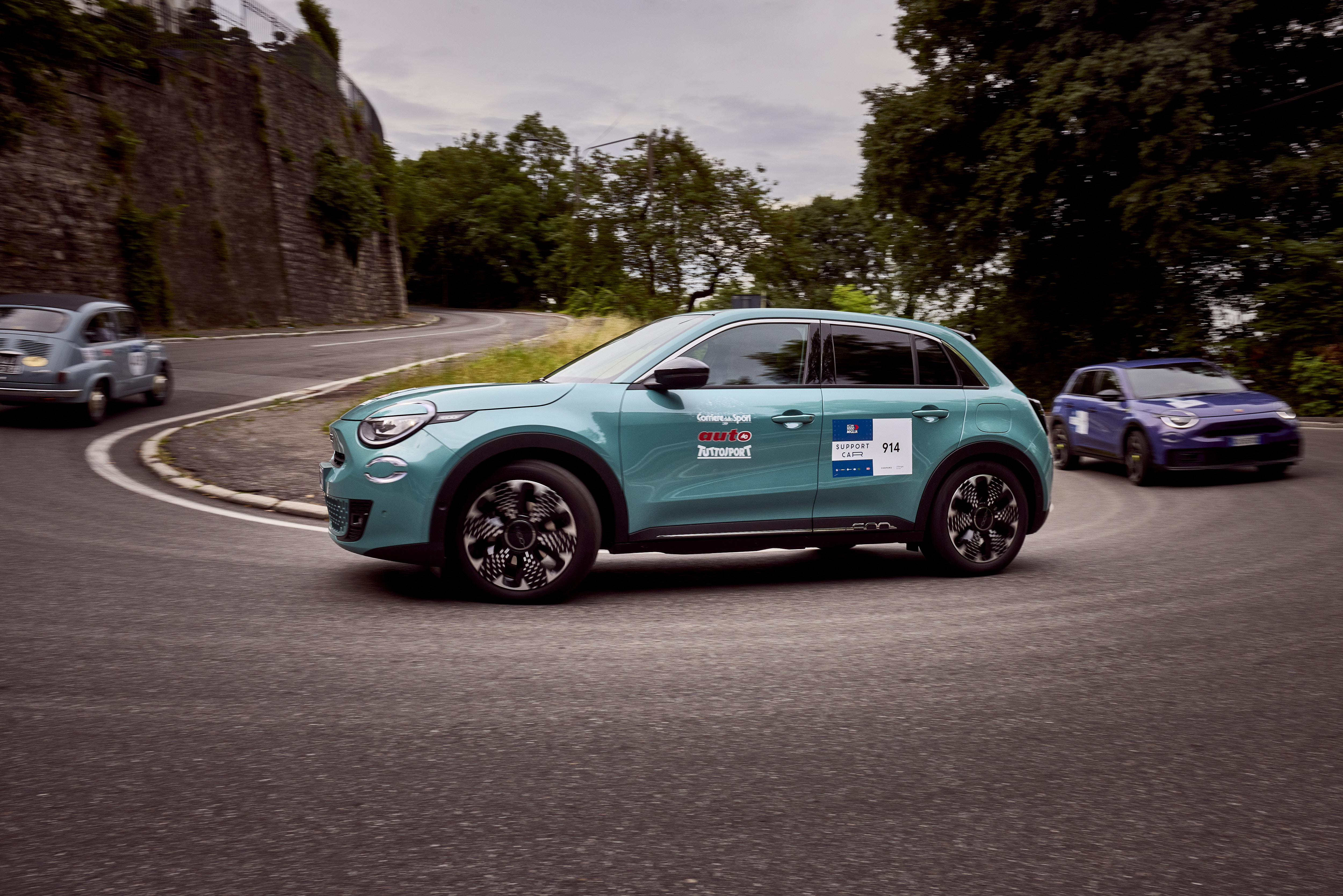 FIAT deltar stolt i den 43:e upplagan av 1000 Miglia och följer den ikoniska rutten från Brescia till Rom och tillbaka – med den legendariska Fiat 600, som i år firar 70 år sedan sin debut år 1955. Till stöd för den historiska 600:an under hela resan finns Fiat 600 Hybrid som ”Support Car” – en modern symbol för FIATs pågående utveckling. Tillsammans hyllar de varumärkets rika arv och framtidsfokus – där tradition möter innovation längs vägarna i detta tidlösa italienska lopp.
