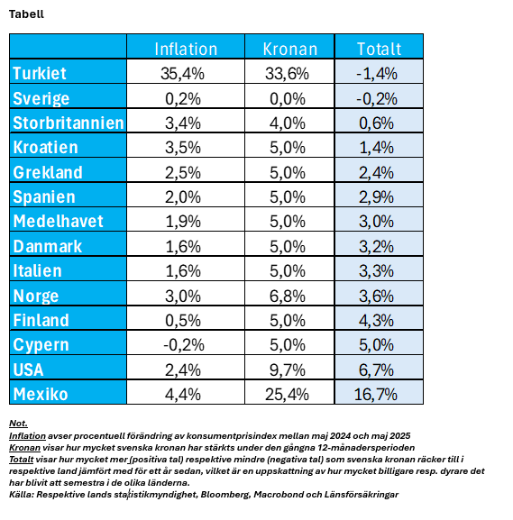Svenska kronan har stärkts under våren, och även om utvecklingen planat ut de senaste månaderna är kronan fortfarande starkare än både vid årsskiftet och förra sommaren. Det innebär att semesterkassan räcker lite längre för svenskar som reser utomlands i sommar. Men effekten varierar kraftigt mellan olika länder – och på de mest populära resmålen är ökningen av köpkraften fortfarande ganska blygsam. Det visar en ny sammanställning från Länsförsäkringar.