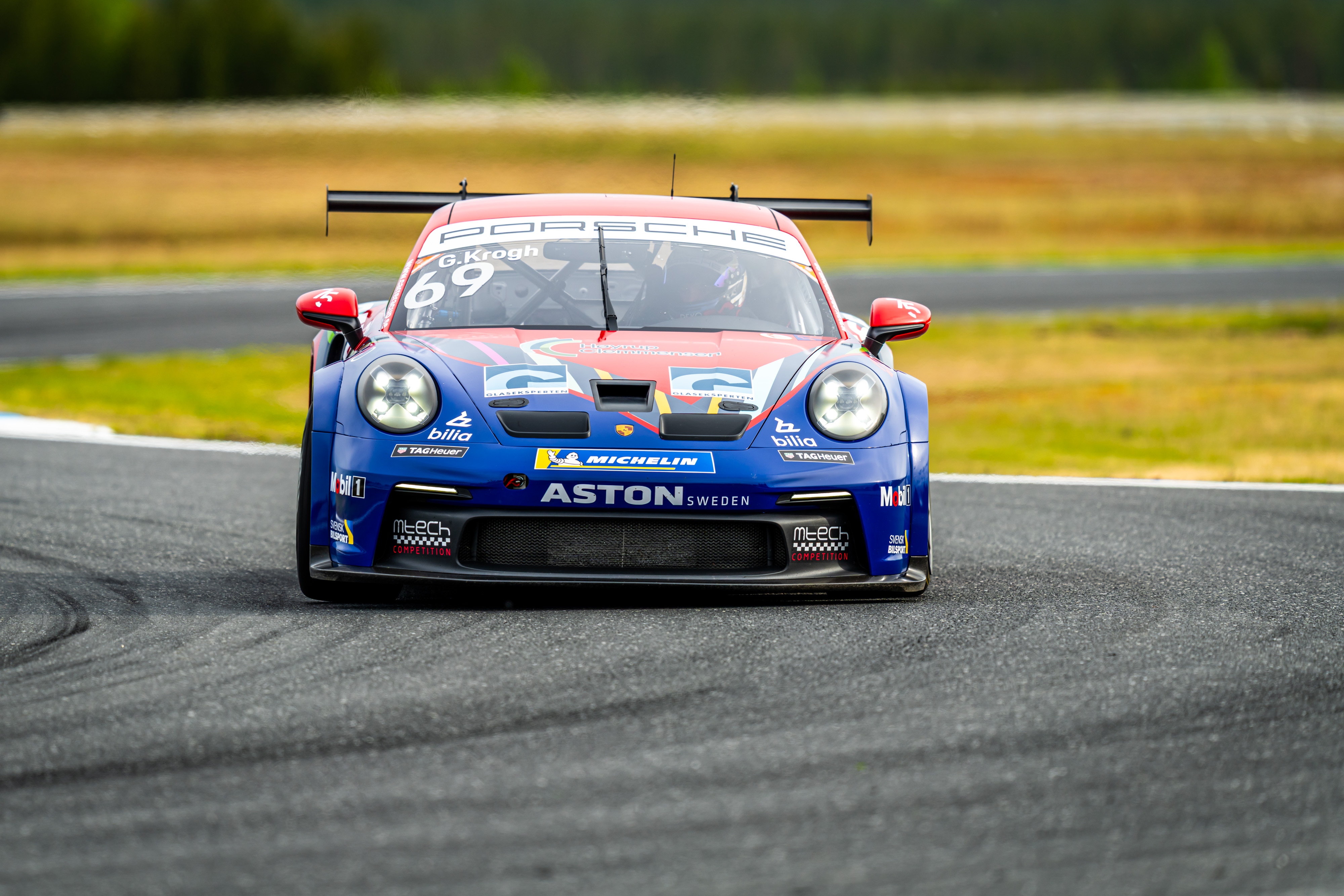 Betydligt gladare efter fjolårets deltävling på Jylland var hemmaföraren, danske Gustav Krogh, Mtech Competition. Sjätteplatsen i race ett följde han nämligen upp med en andraplats i det andra. Det var första gången Krogh stod på pallen i Porsche Carrera Cup och han hyllades stort av hemmapubliken.