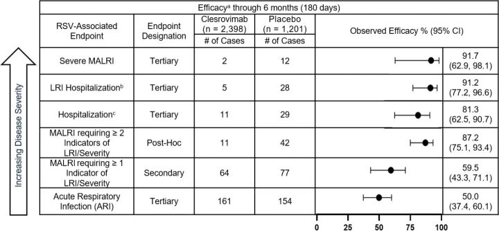 Studiens primära effektmått, definierat som förekomst av RSV-relaterade luftvägsinfektioner som krävde sjukvårdskontakt (inklusive sjukhusinläggning) (MALRI) med ≥1 tecken på nedre luftvägsinfektion (LRI) eller ≥1 tecken på allvarlighetsgrad jämfört med placebo till och med dag 150 (5 månader) efter dosering, var 60,4 % (95 % KI: 44,1, 71,9, p <0,001). Behandling med clesrovimab minskade också RSV-relaterade sjukhusinläggningar (sekundärt effektmått) till och med dag 150 jämfört med placebo med 84,2 % (95 % KI: 66,6, 92,6, p <0,001).