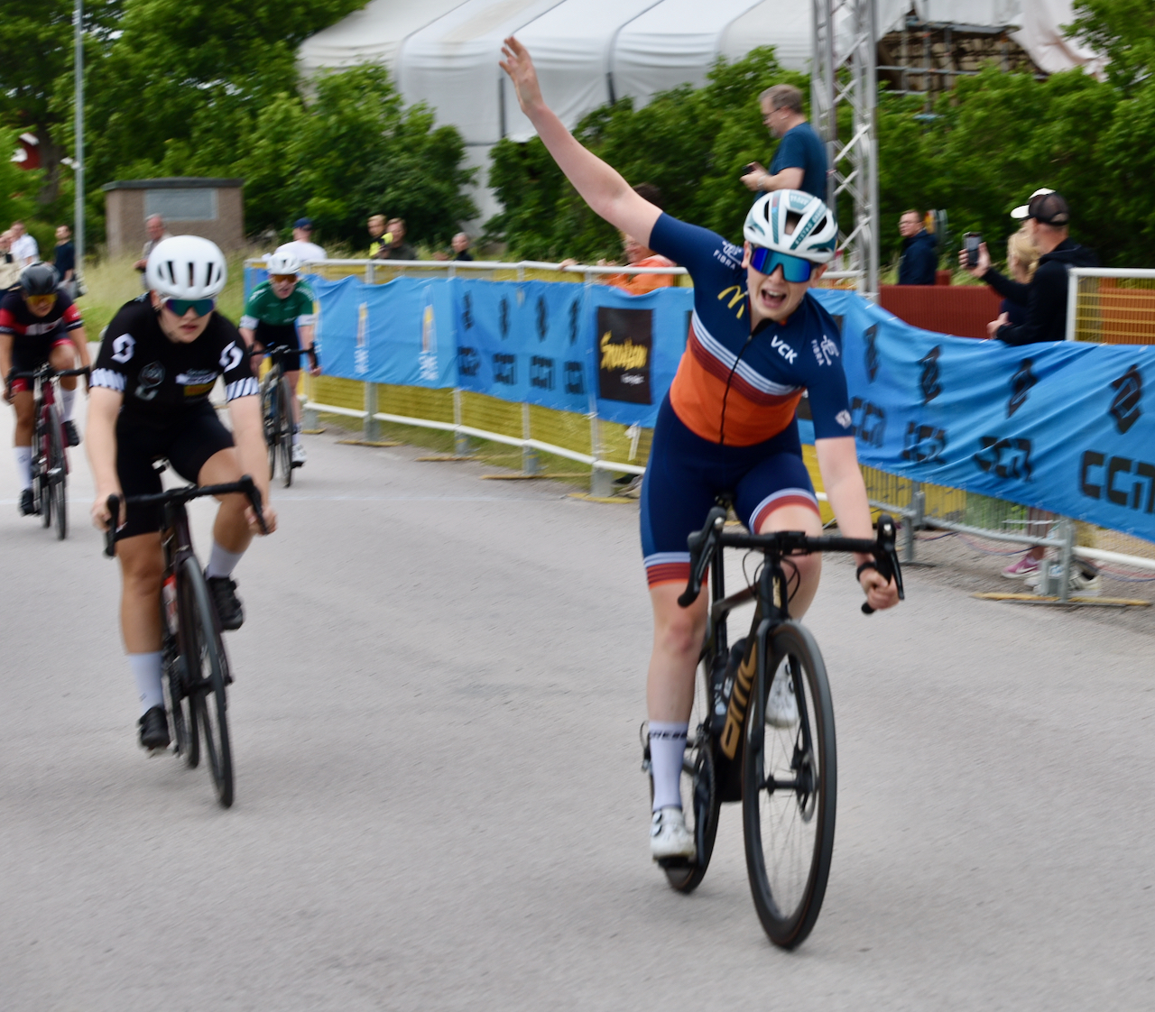 ”Jag kände faktiskt inte av den alls. Jag hade så ont i benen ändå att det inte gjorde någon skillnad. Man ska ju inte titta bakåt i det läget. Men jag gjorde det ändå. Och inför de sista 200 meterna kände jag att jag ska nog kunna ta det här ändå utan att ramla av cykeln av trötthet just efter mållinjen… man är ju så hög på adrenalin så man känner inte hur trött man är på slutet heller. Det känns ju efteråt, liksom…”