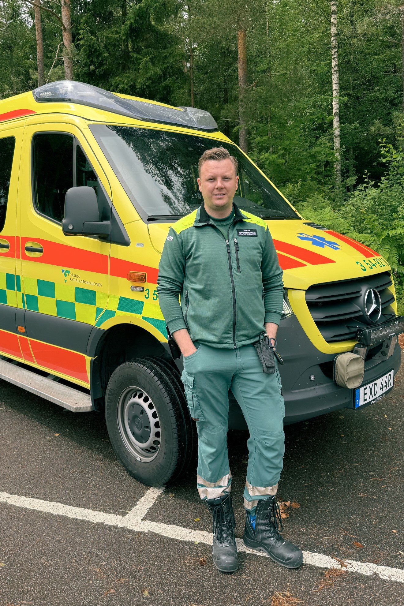 Efter studenten arbetade Tobias Fransson som undersköterska på en vårdavdelning på NÄL. Sedan han blev färdig ambulanssjukvårdare har han stannat kvar i NU-ambulansen.