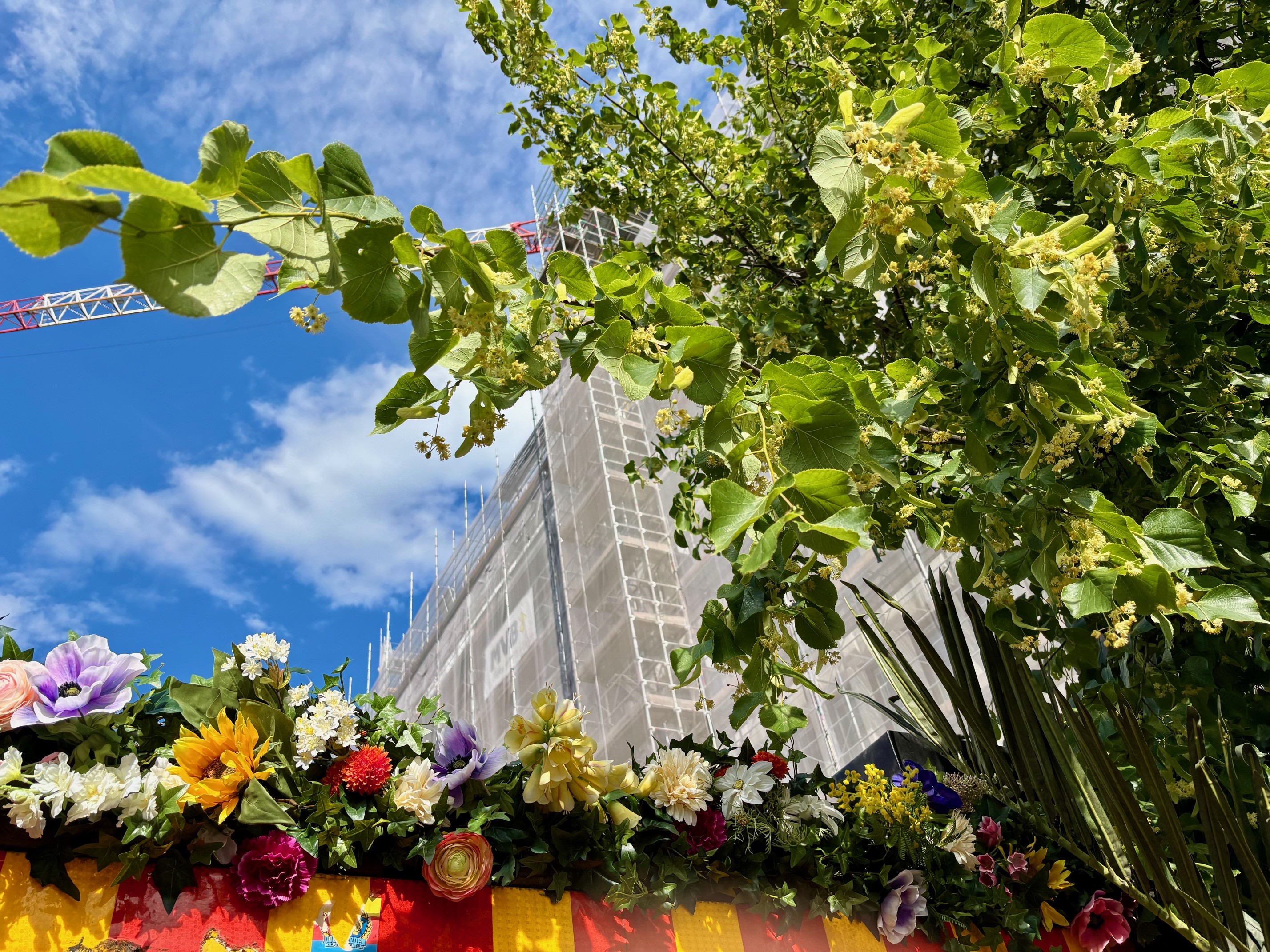Tunneln består av blommiga vepor och entréerna har smyckats med blomsterbågar, allt för att skapa en trevligare plats i väntan på att nästa kapitel av Fridhemsplan ska stå klart.