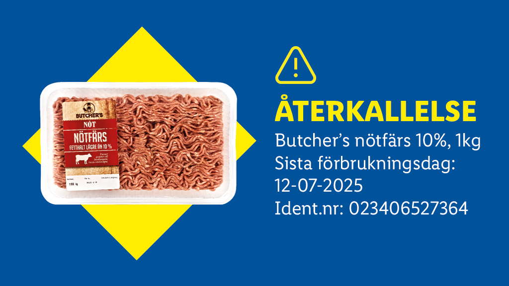 Lidl Sverige återkallar nötfärs med fetthalt lägre än 10% av varumärket Butcher’s då det finns risk för tunna plastbitar i förpackningen. Samtliga berörda produkter är bortplockade ur butik.