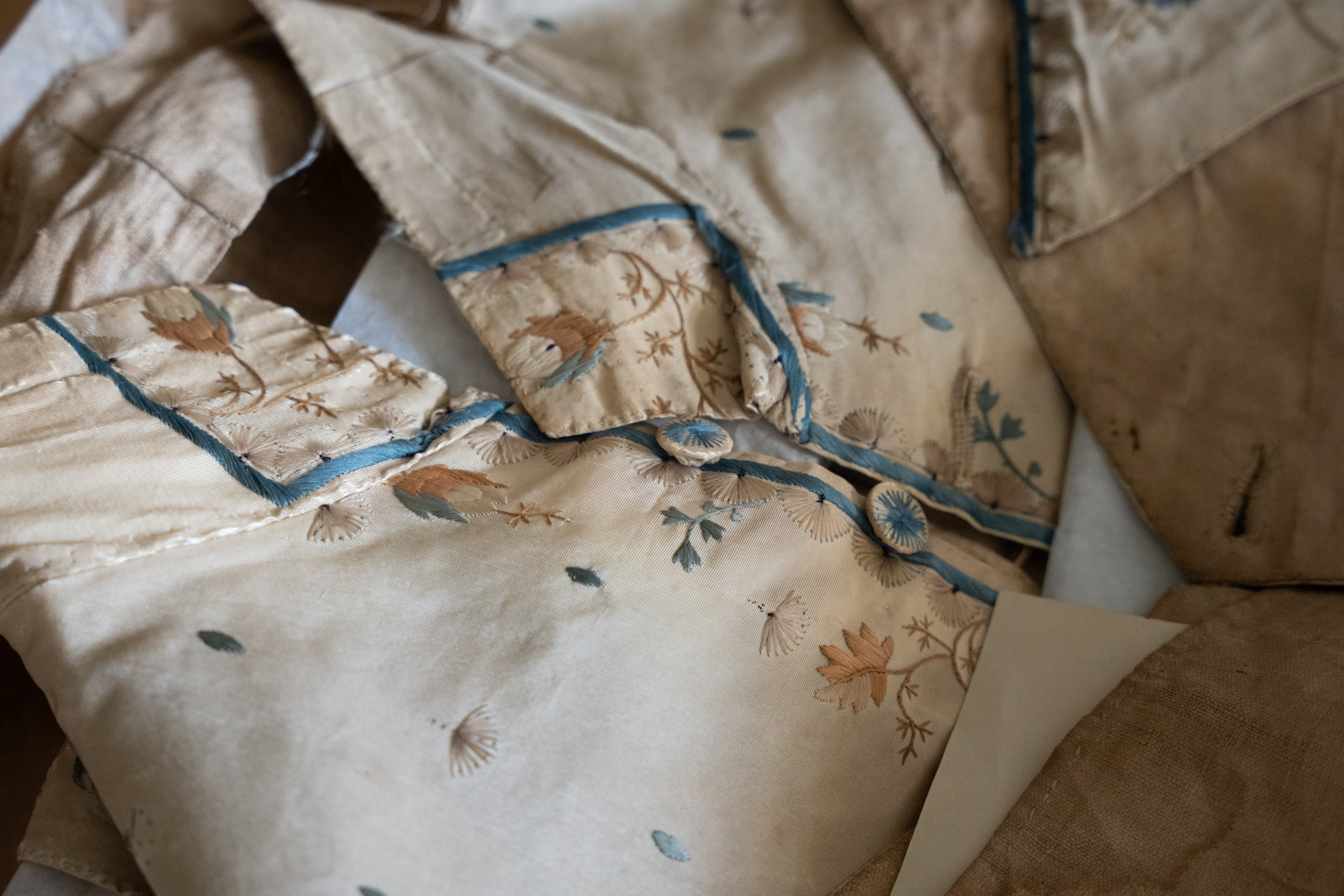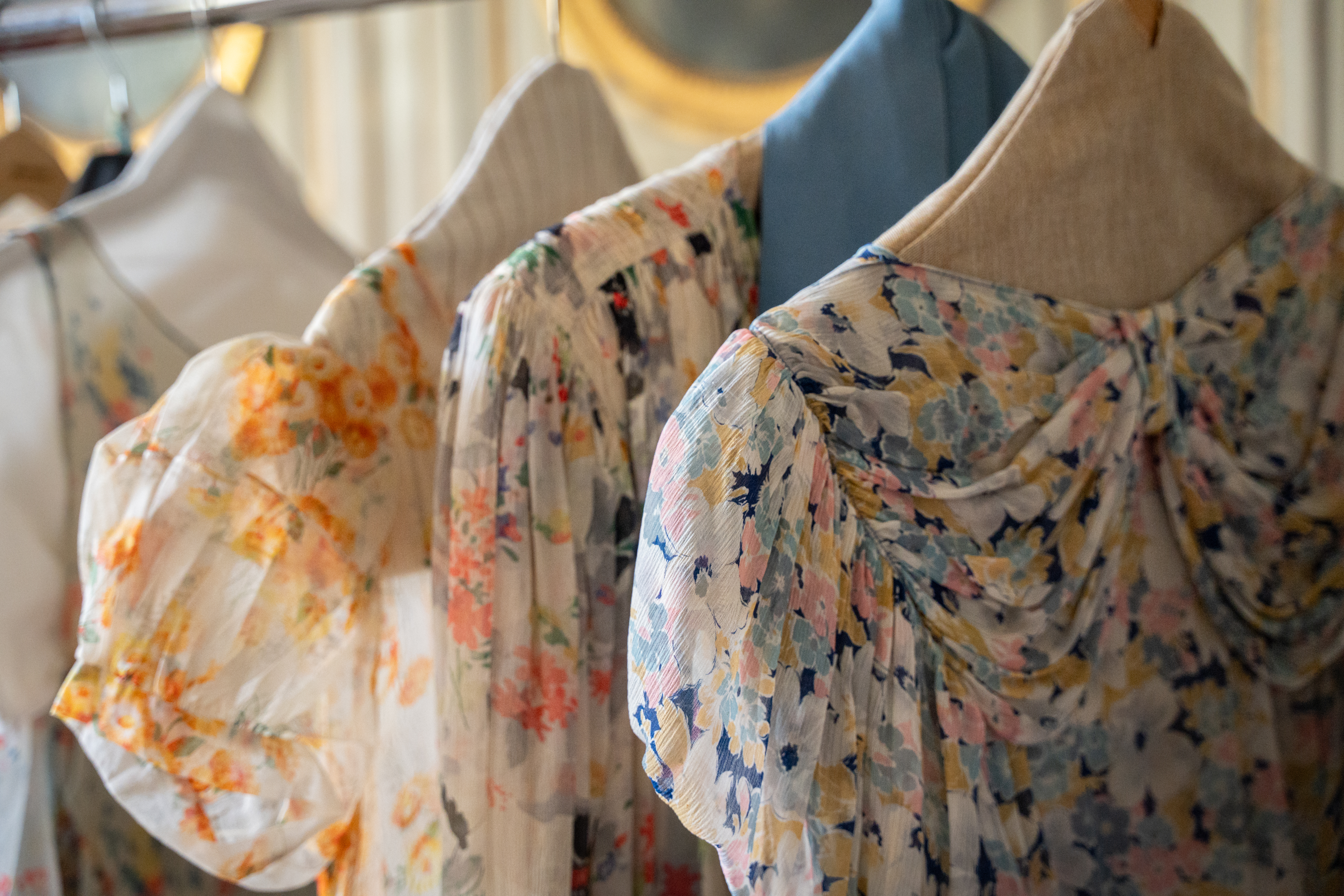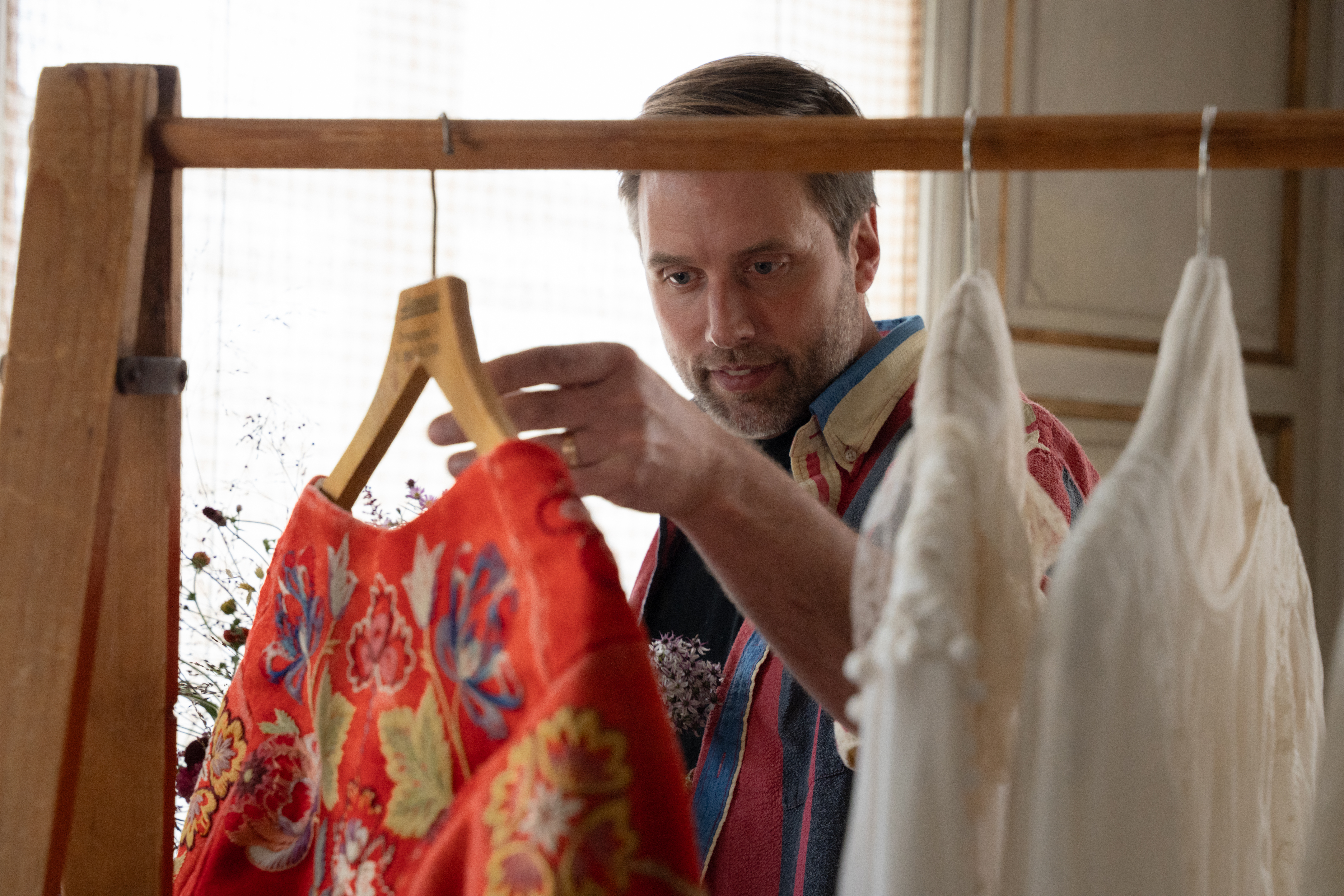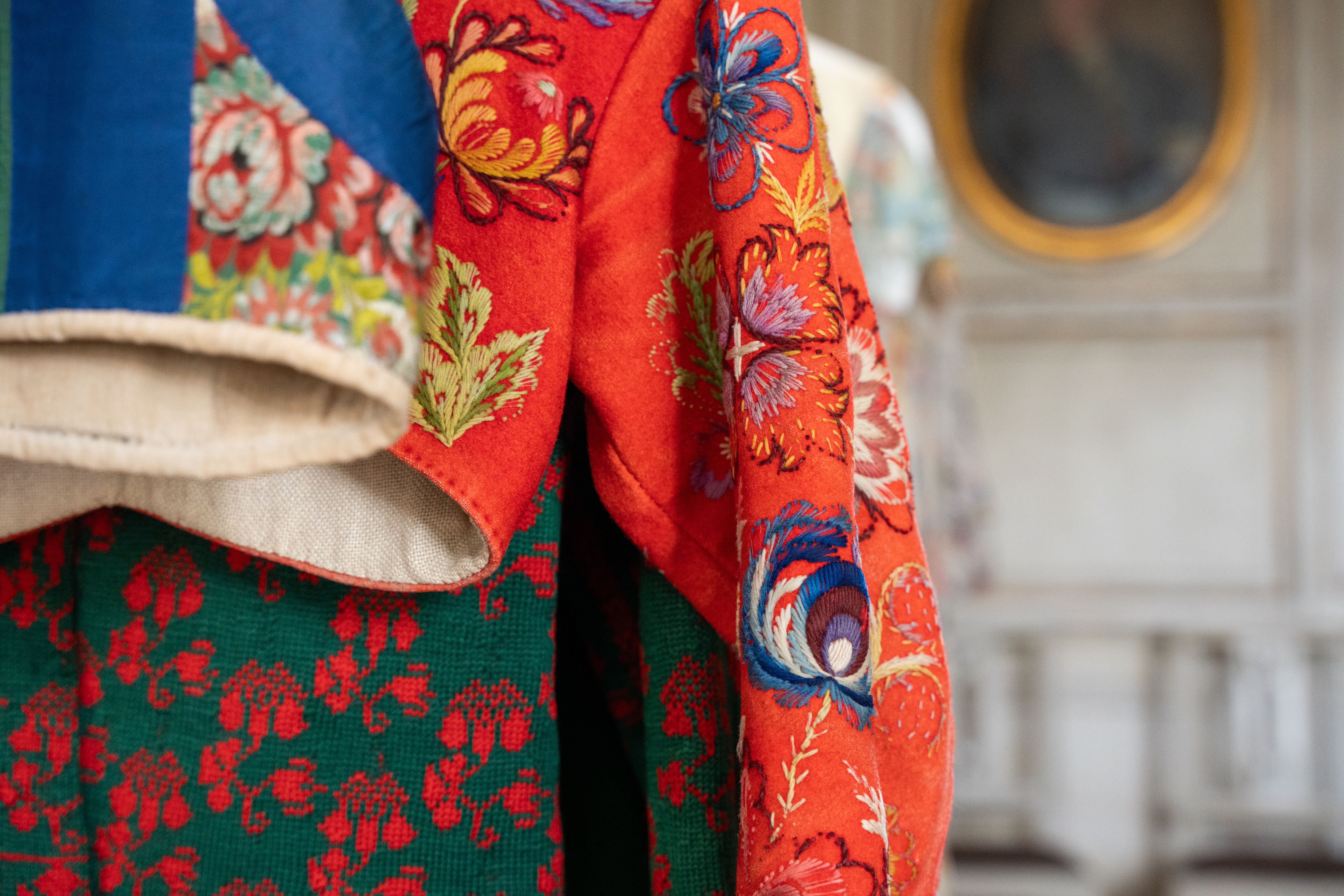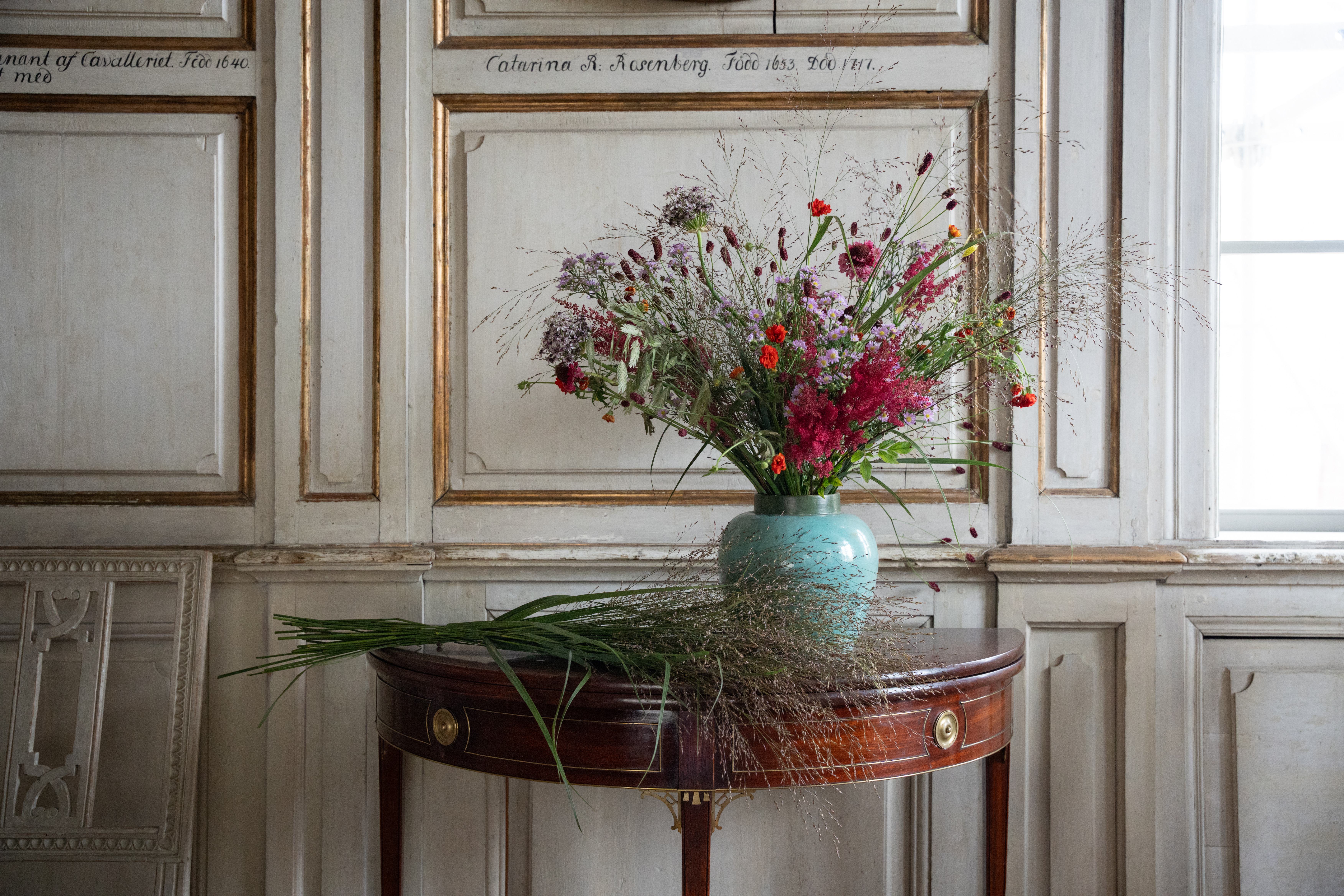 ”Att få arbeta i en miljö som bär så mycket historia är en ynnest – det är som att tjuvlyssna på väggarnas berättelser medan man arbetar. Det känns fint att vara tillbaka, nu med höstens skiftningar som ny kuliss. I varje rum försöker jag låta blommorna föra dialog med plaggen – de dolda stygnen, de blekta broderierna, känslan av ett liv som levts.”