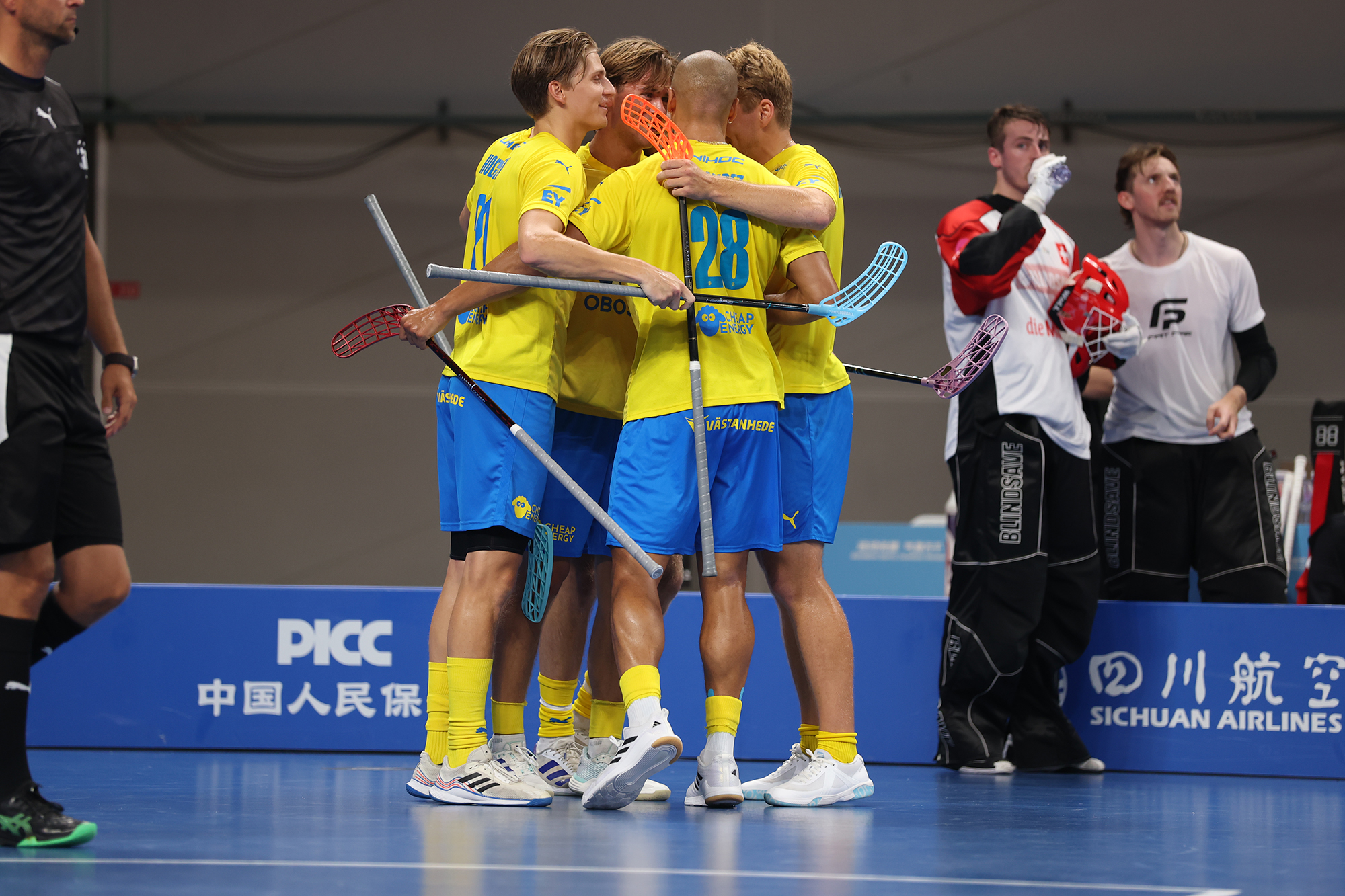 Sveriges herrlandslag tog hem premiären av The World Games i Kina mot Schweiz med 8-1 efter hattrick av matchens lirare, Malte Lundmark.