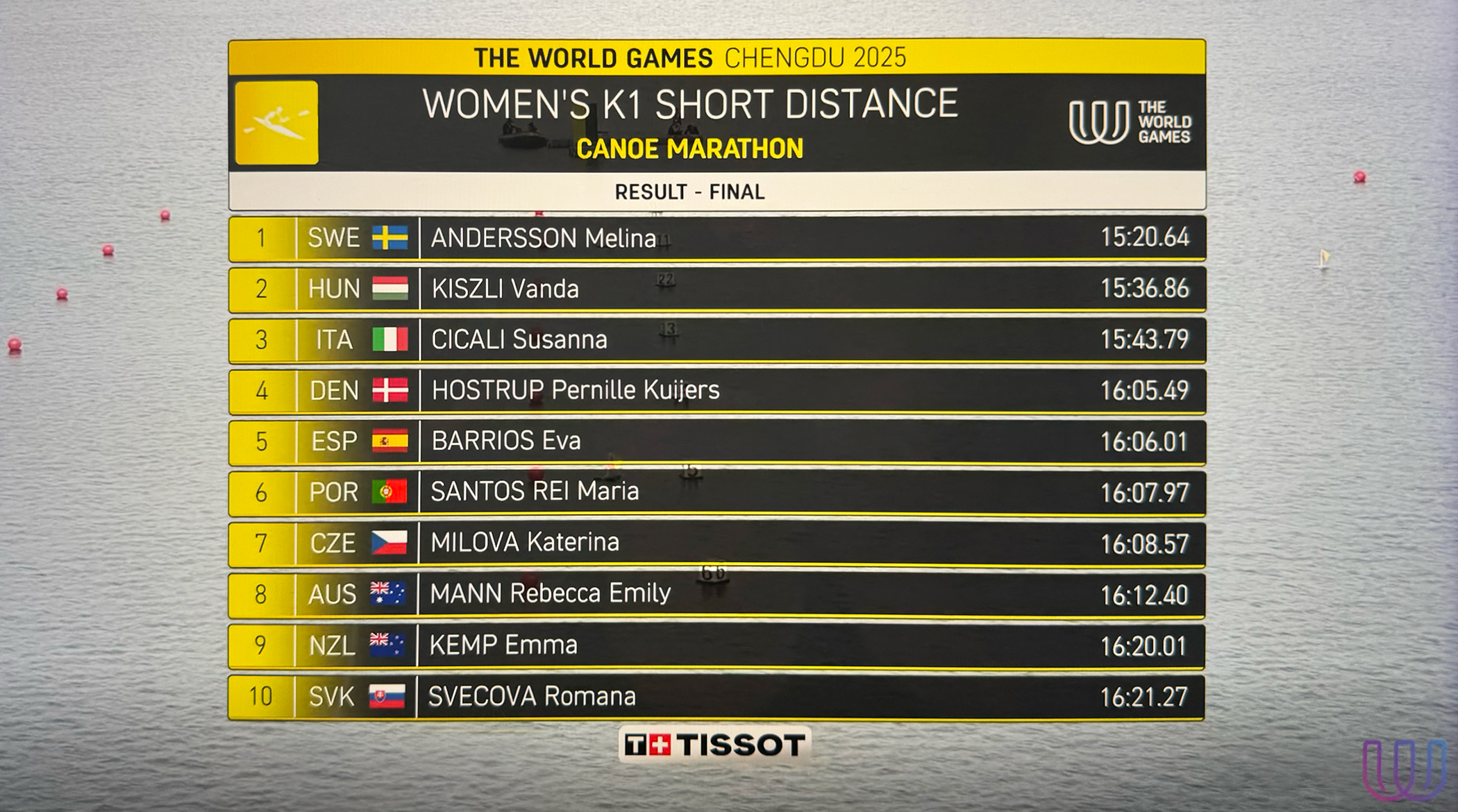 Tidigare i veckan sa hon att hon skulle göra "vassa lyft" och "vinna" – idag visade hon vad det innebär. Ut på slutvarvet gav hon sig själv förutsättningarna att vinna genom just ett makalöst lyft där det till slut blev för många sekunder för Kiszli att ta igen. Cicali tappade mycket i sista lyftet då hon var tvungen att tömma kanoten på vatten, men kunde sedan paddla in som ohotat trea.