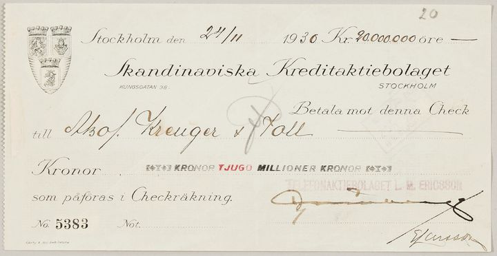 Historiens vingslag var definitivt närvarande i salongen när en check på 20 miljoner kronor, ställd till den världskände svenske företagsledaren Ivar Kreuger i november 1930, såldes för 125 000 kronor. Under depressionen hade Krueger ont om likvida medel och checken vittnar om att han i praktiken lånade pengar av L M Ericsson (idag: Ericsson) för att köpa bolaget. Att förvärva ett bolag med dess egna medel är numera förbjudet.