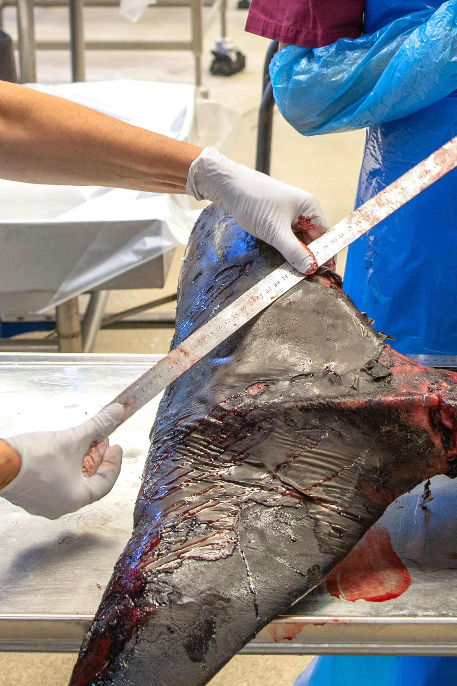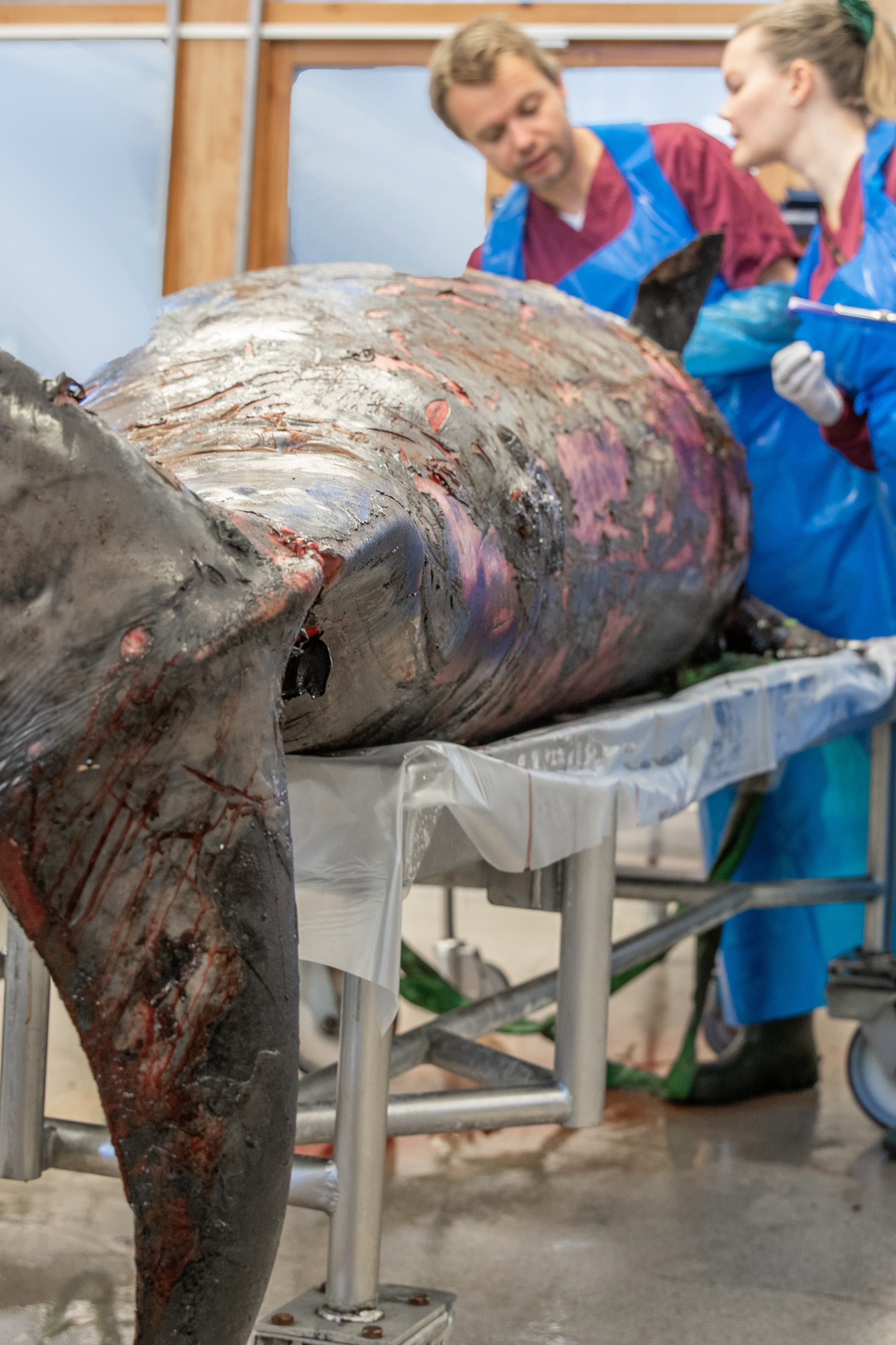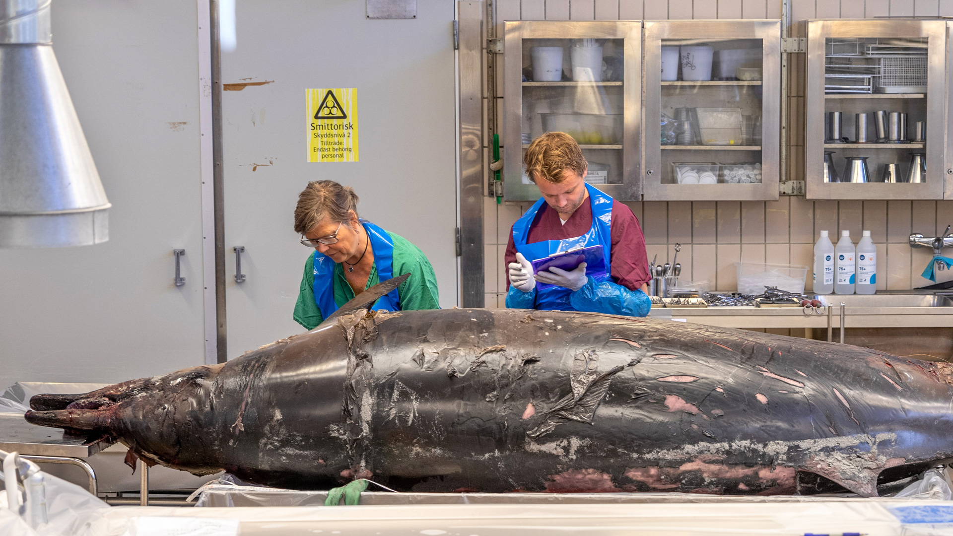 – Vår första undersökning visar att näbbvalen var i fint skick, med bra hull och inga sjukliga förändringar. De skador som syns är ytliga och kommer från skador i samband med strandningen, alternativt efter döden. Huvudet har skickats för CT-skanning och prover har tagits för vidare undersökningar om det kan vara miljögifter, genetik eller sjukdomsalstrande bakterier och virus som gör att de strandar, säger Moa Naalisvaara Engman, marinbiolog på SVA.